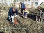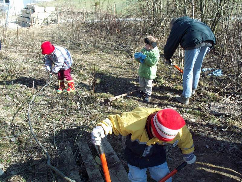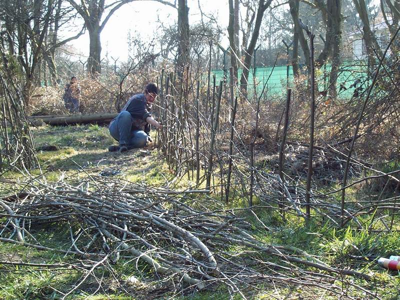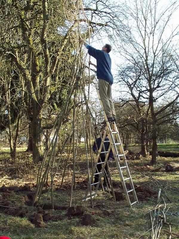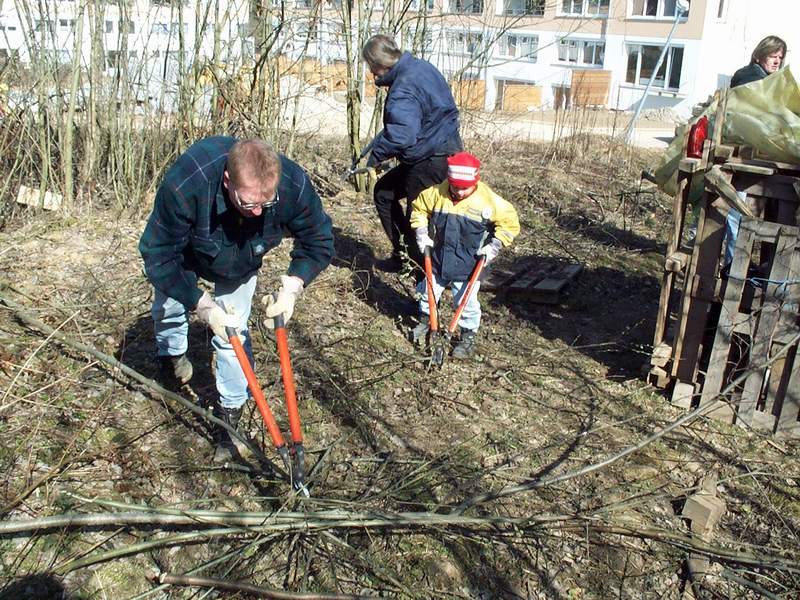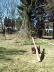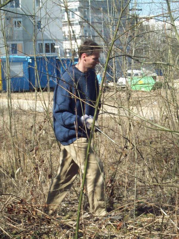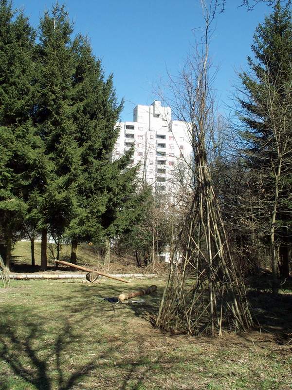 Als klar war, dass die Weiden zwischen dem Hanne-Schorp-Pflumm-Weg und dem Oskar-Kokoschka-Weg im Zuge der weiteren Bauarbeiten bald weichen müssen, hatten wir uns zum Weiterbau des Abenteuerspielplatzes um die im September errichteten Weidentipis entschlossen. Am Samstag, dem 22. März 2003 trafen wir uns mit Sägen und Astscheren und legten los. Alles weitere kann in der folgenden Bildergeschichte nachgelesen werden.
