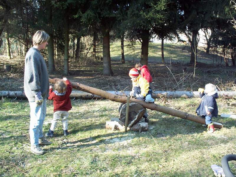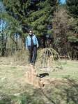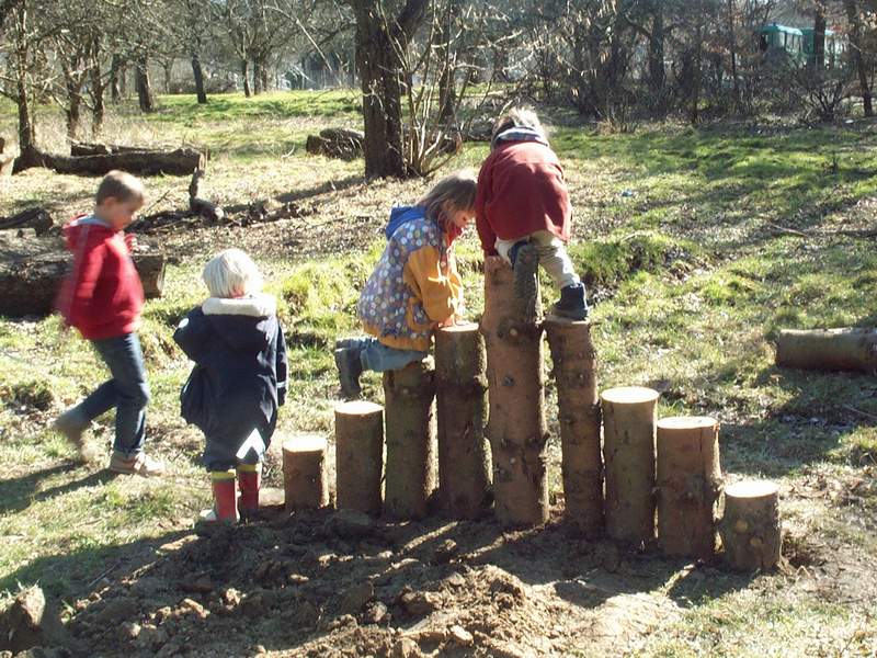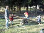 Im vorigen Bild ist das  dritte Weidentipi im Entstehen. Im Bild oben wird der Weidenzaun gepflanzt und geflochten. Eins der ersten Tipis und die selbst gebaute Wippe. Diese gibt dem Gelände, das mit mehreren Tipis ein Dorf bilden wird, den Charakter eines richtigen Spielplatzes.  Dazu trägt auch die Kletterpalisade bei, die hier von einem "großen Kind" getestet und für gut empfunden wird.