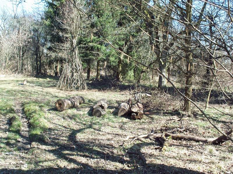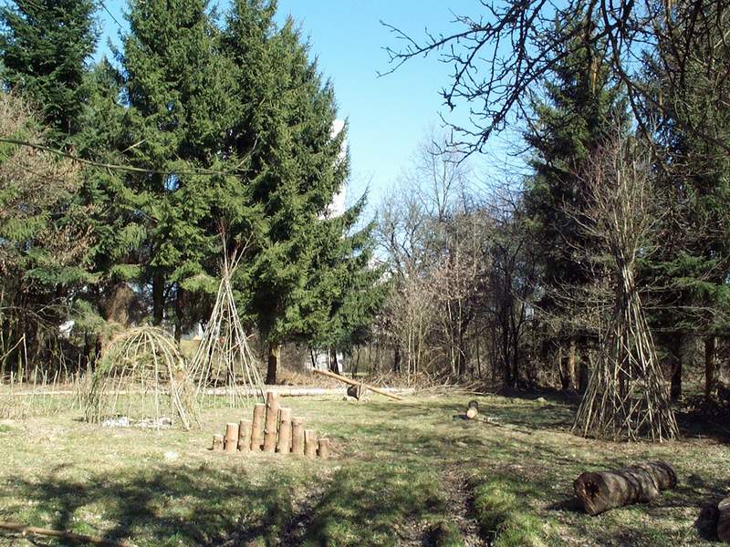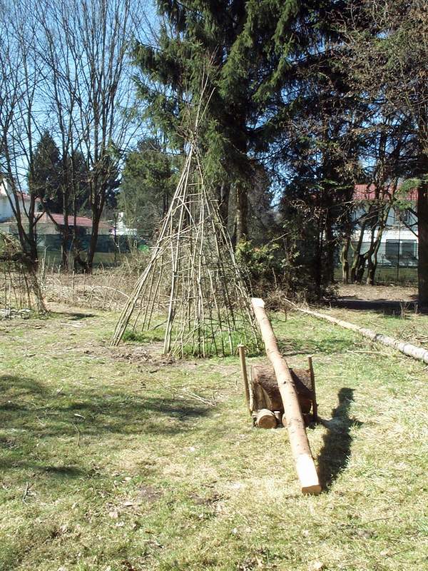 Das Tipidorf in der Totalen mit Palisade und Wippe. An dieser Stelle wird im Schatten der Obstbäume eine Feuerstelle mit ...  ... einem Rund von Baumstämmen zum Sitzen entstehen.
