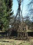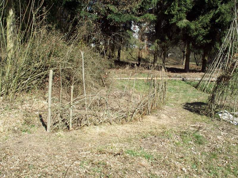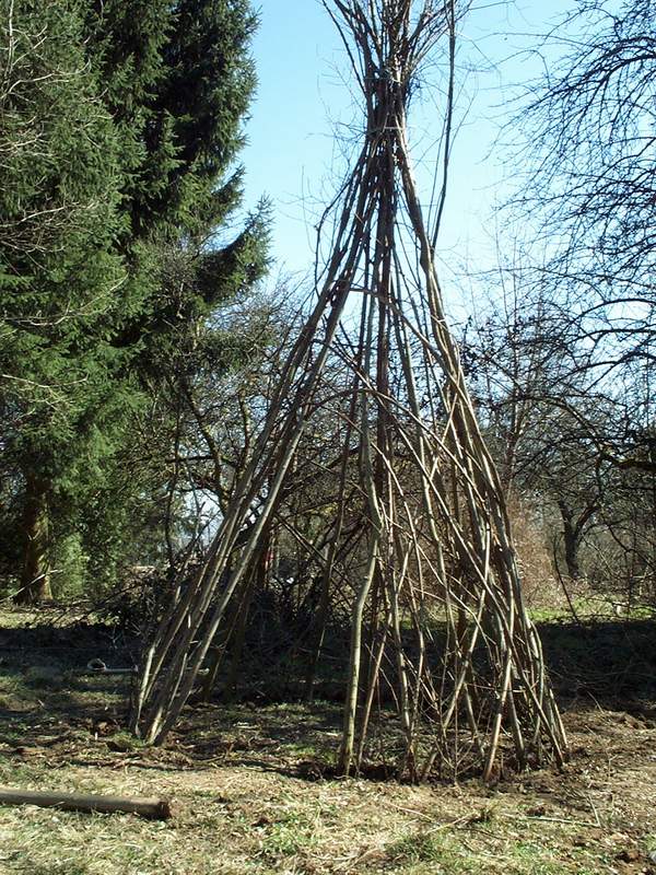 Der Weidenzaun soll nicht abgrenzen, sondern den Dorfcharakter hervorheben. Das dritte Tipi vor der Kulisse der neuzeitlichen  "Lauchhau-Tipis". Fachgerecht geflochten müssen die Weiden jetzt bloß noch anwachsen und sprießen.