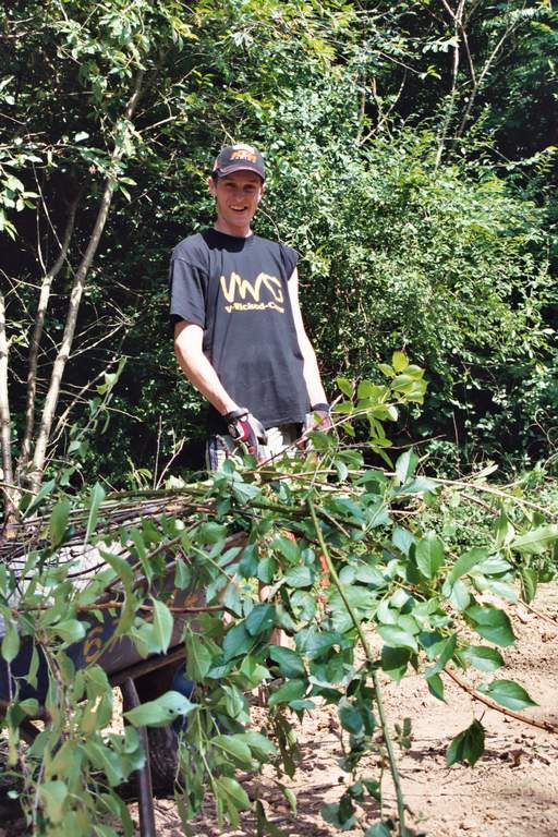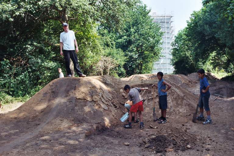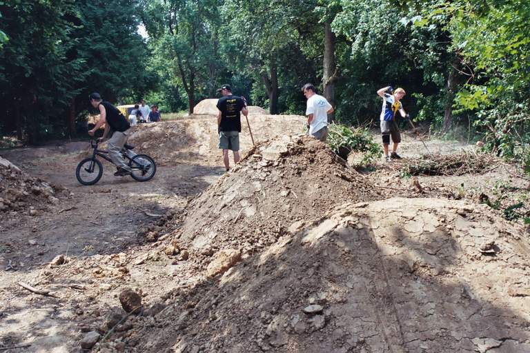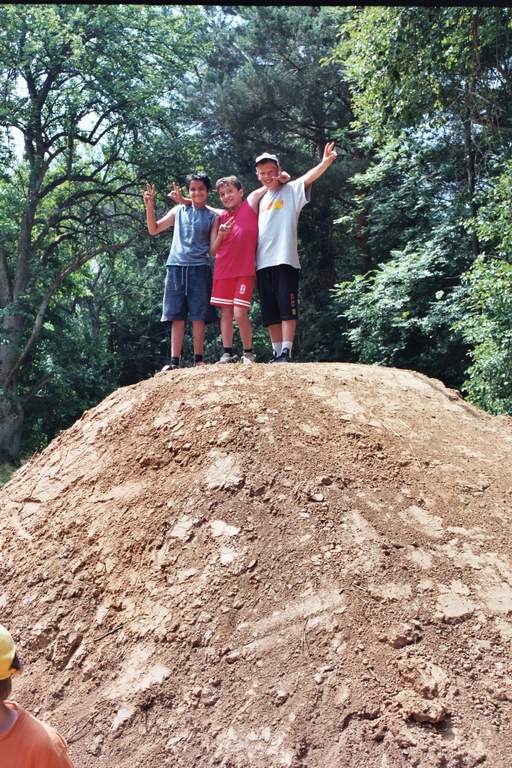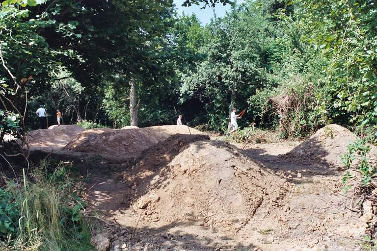 In den Wochen vor dem Lauchfest 2003 wurde die Geländemodellierung der Fahrradbahn mit viel Aushub aus den Baustellen in den Lauchäckern vorbereitet.   Die Feinarbeit sollte am heutigen Tage von der Arbeitsgruppe Fahrradbahn vorgenommen werden. Die Leitung der Arbeiten hatten die Jugendlichen der Fahrradgruppe, die den Bau der Fahrradbahn angeregt hatten.