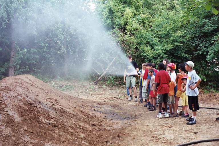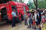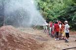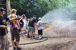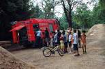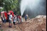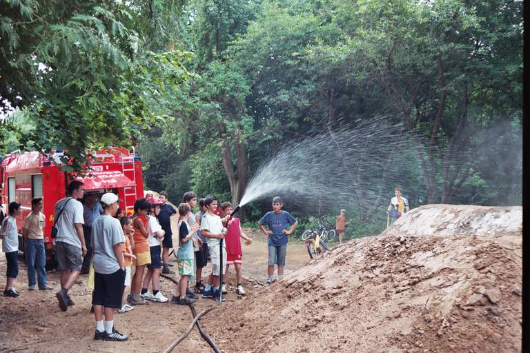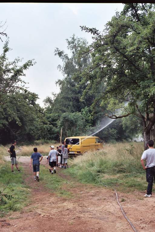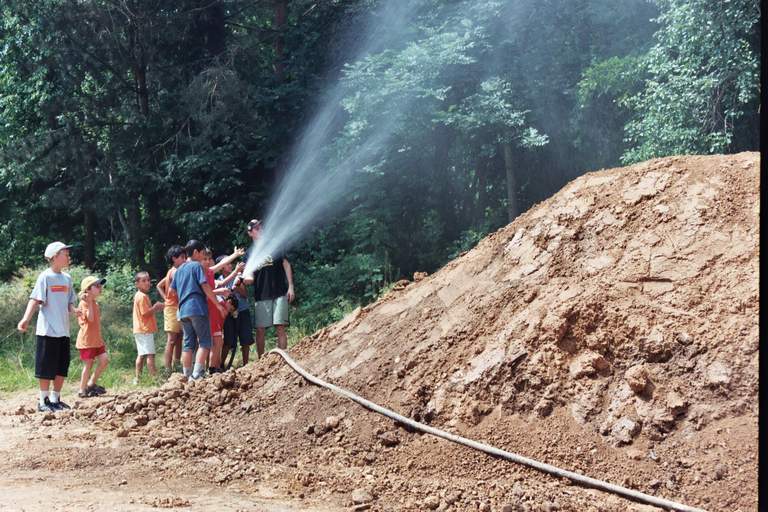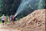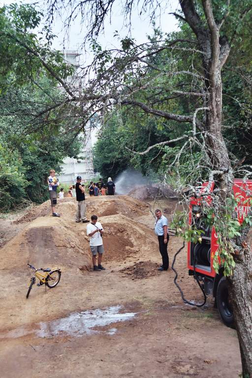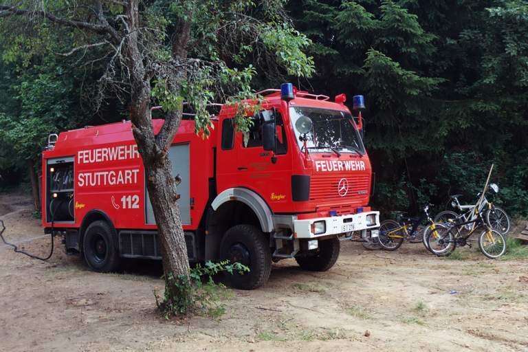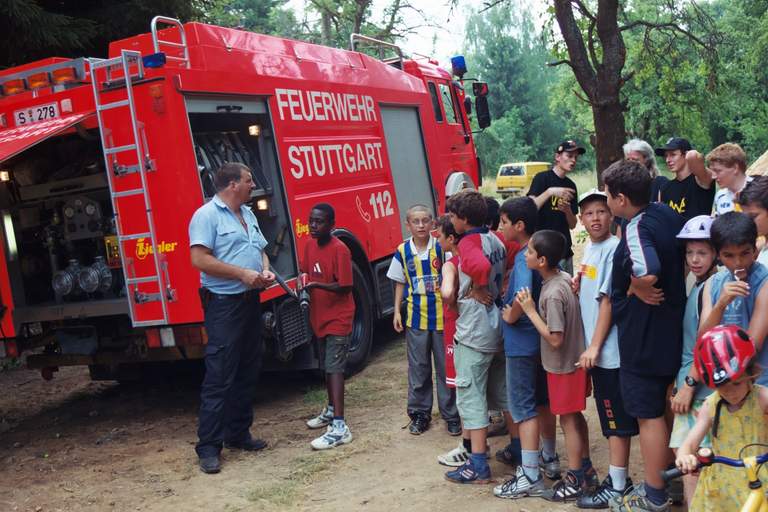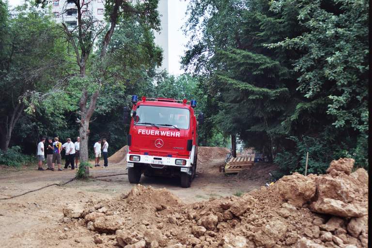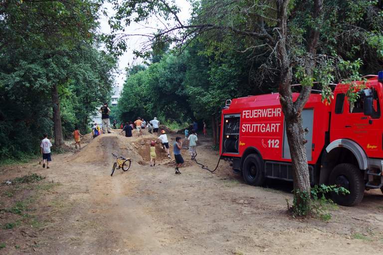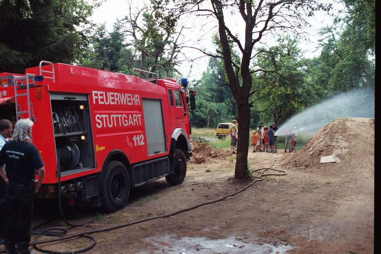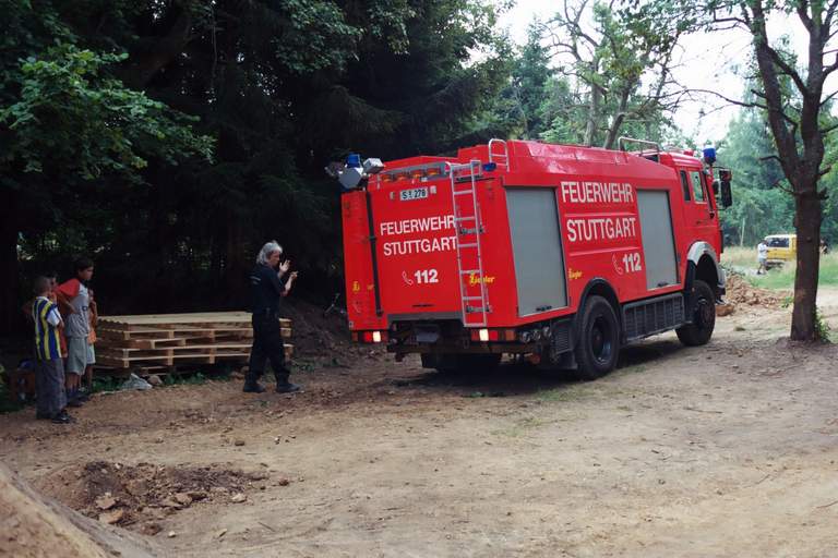 Nach telefonischer Anfrage rückte ganz spontan ein Löschfahrzeug aus Stuttgart-Degerloch an und unterstützte die Aktion mit ca. 2500 l Wasser. Mit dem Wasser konnte der harte Boden wieder modellierbar gemacht werden. Das Löschfahrzeug war natürlich eine Attraktion. Den anwesenden Kindern und Jugendlichen wurde zuerst das Fahrzeug mit seiner Ausrüstung und seinen Funktionen erklärt.