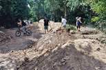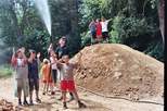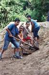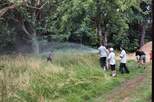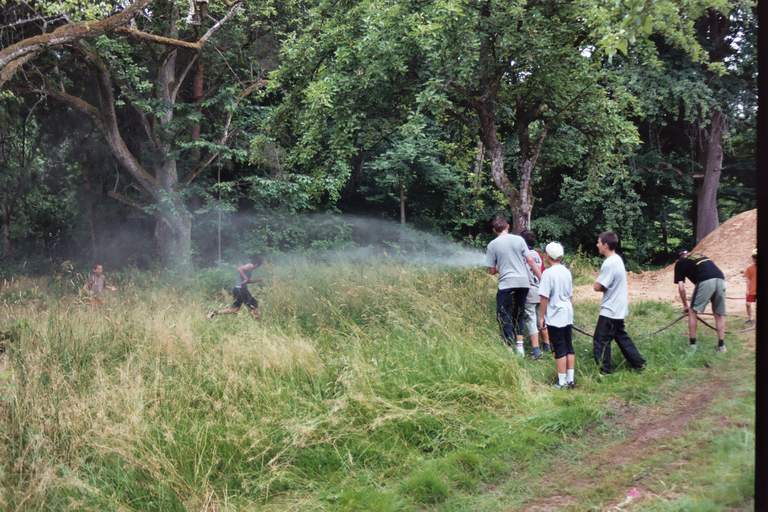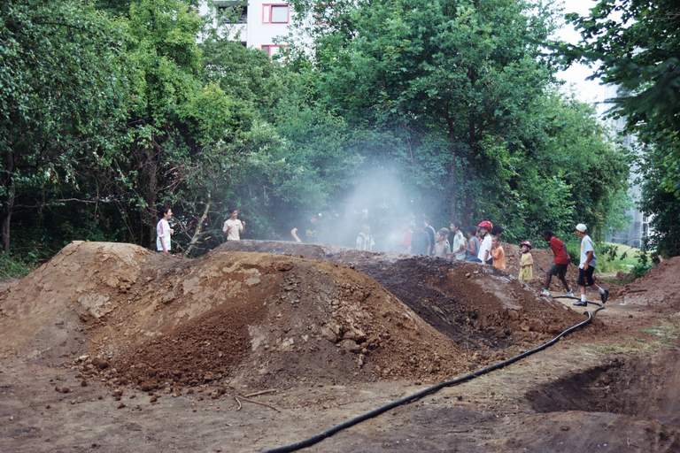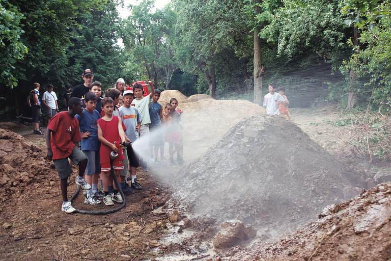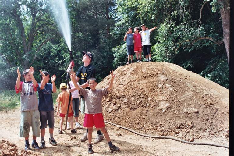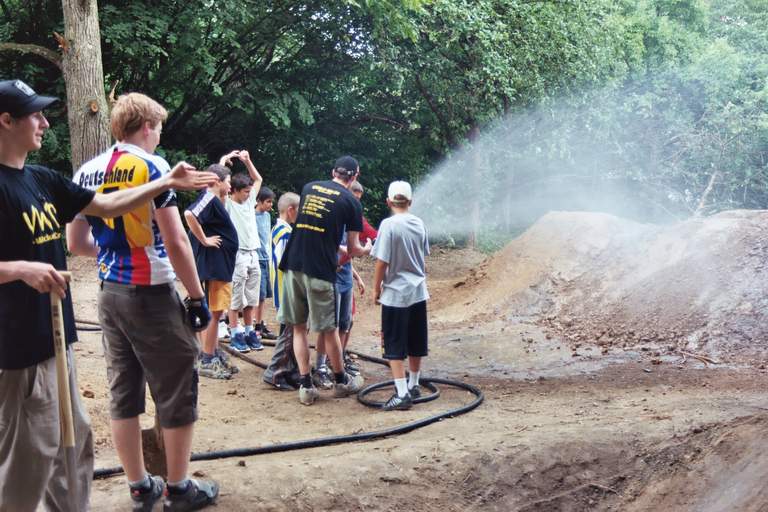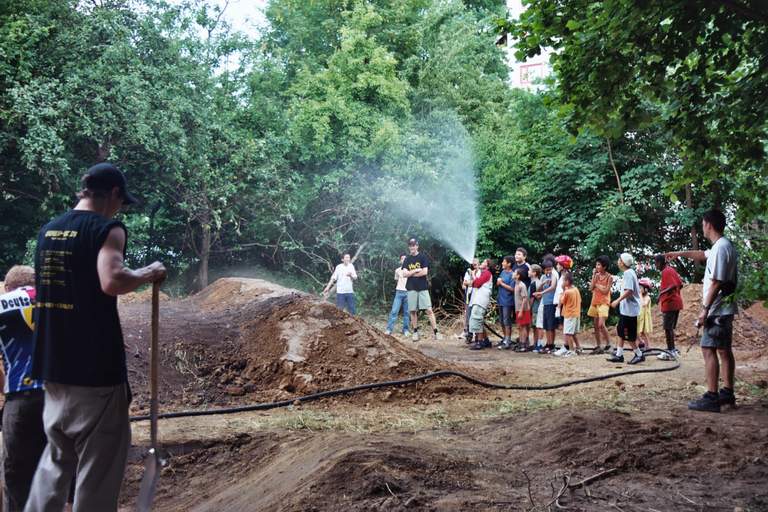 Das war zur weiteren Modellierung und Bearbeitung der Sprunghügel sehr wichtig und hilfreich ... ... und Spaß hat es dazu noch allen Beteiligten bereitet. Verschiedene Techniken zur Berieselung wurden ausprobiert.