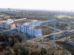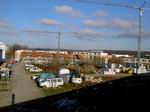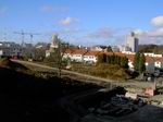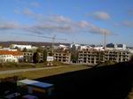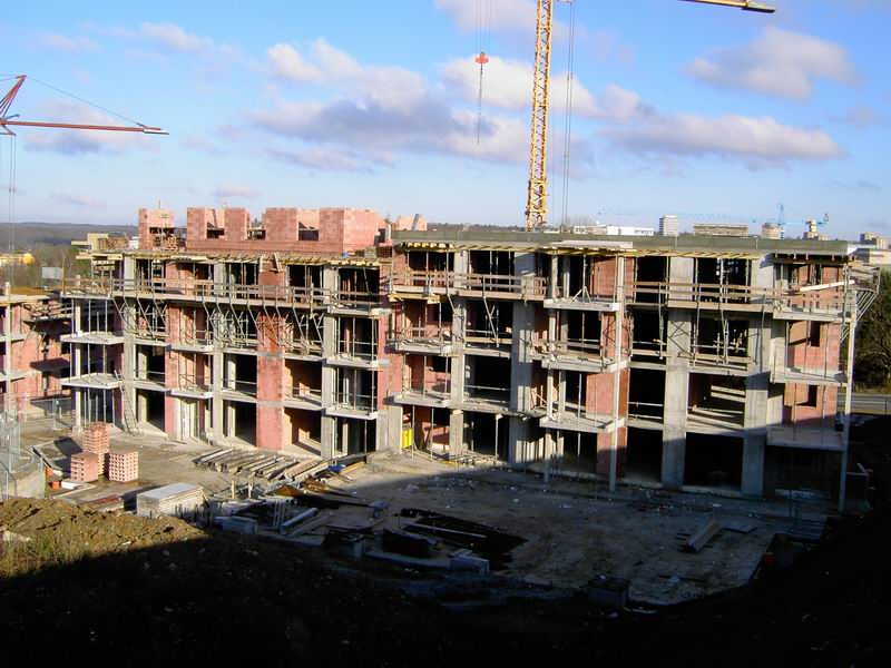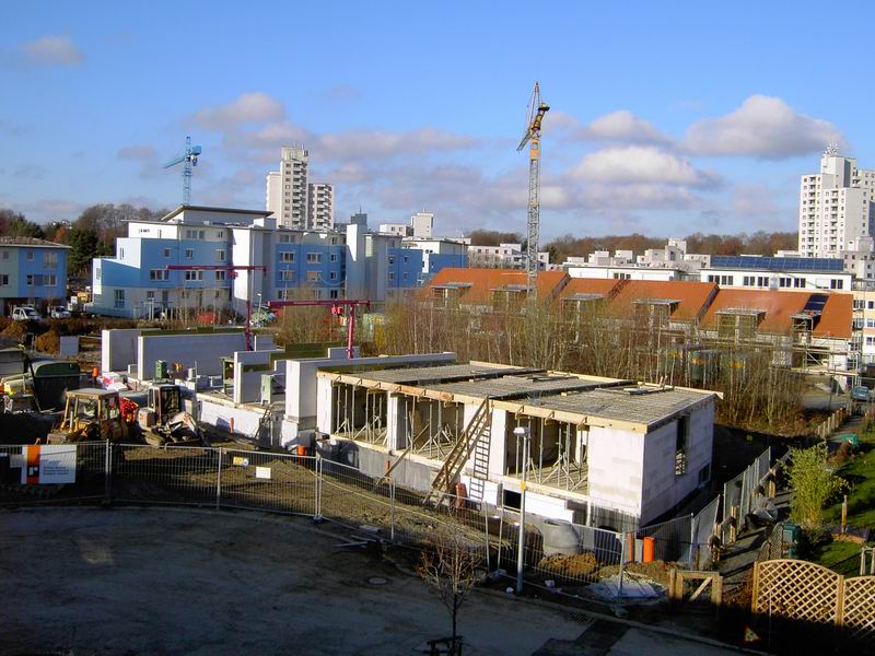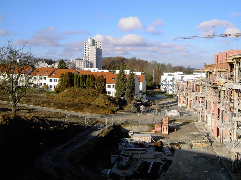 Blick über die Blöcke des Siedlungswerkes zu den Rohbauten an der Büsnauer Straße. Blick über die Blöcke der SWSG zu den Baustellen für Einfamilienhäuser.