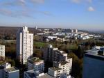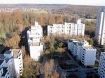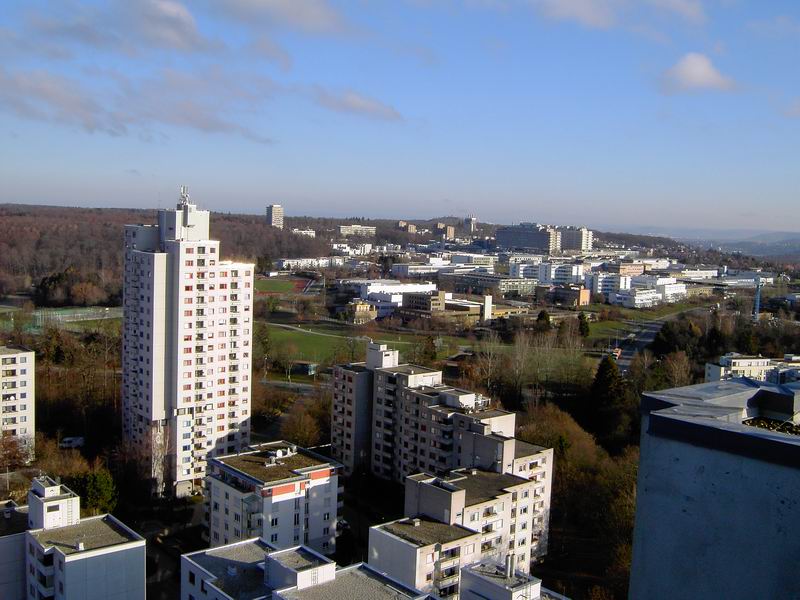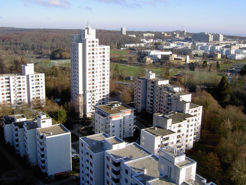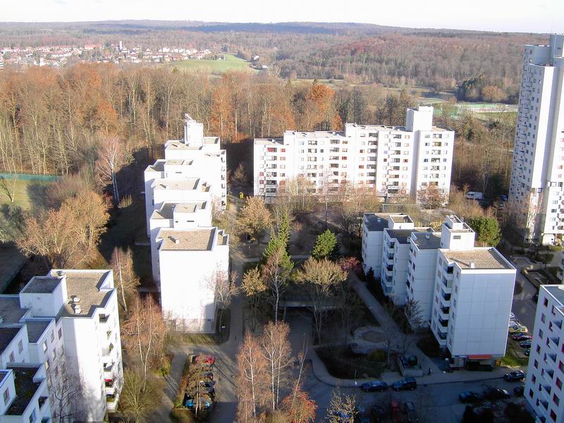 Die Hochhäuser des Lauchhau. Im Hintergrund die Universität. Blick über den Lauchhau hinweg nach Norden. Die Gebäude der Kaserne im Westen.
