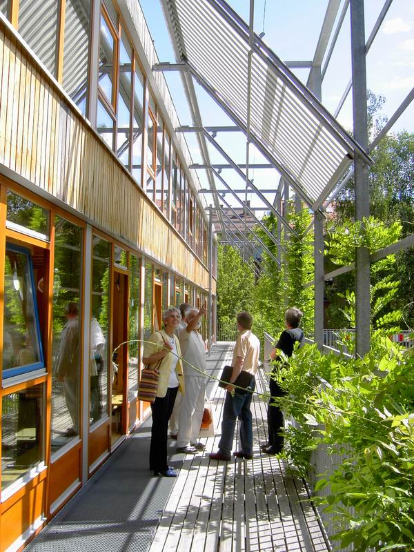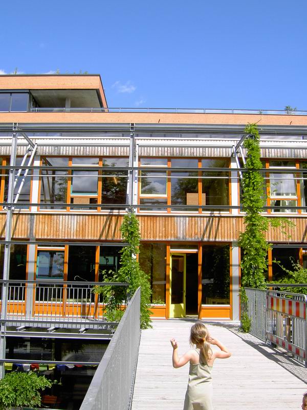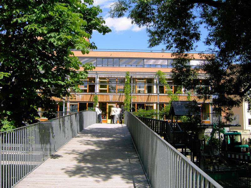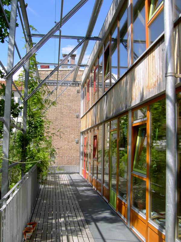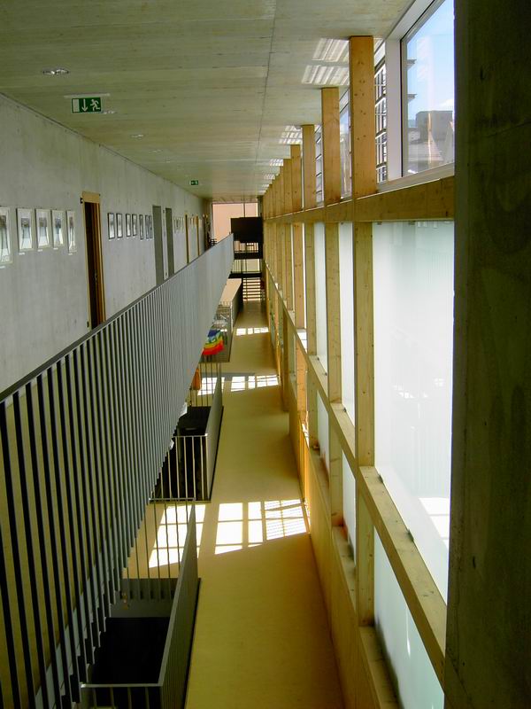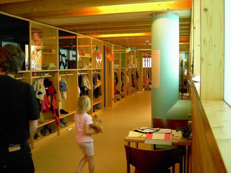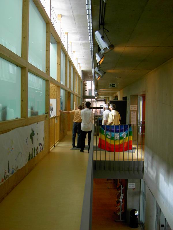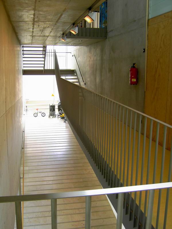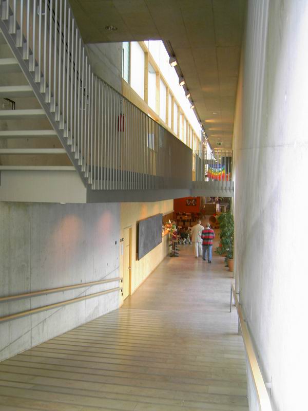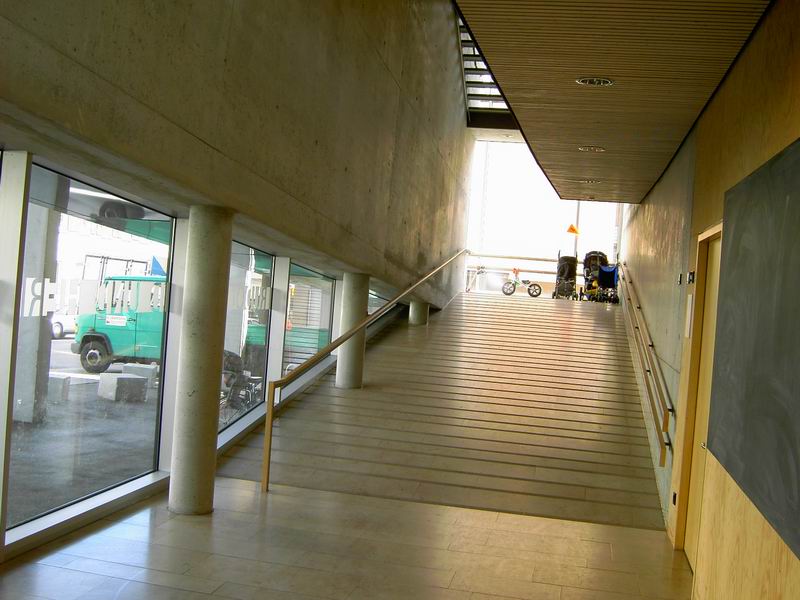 ... in das 1. Oberge- schoss, die Ebene für Kinder. Dort ist der Kindergarten und der Kinderhort untergebracht.  Hier nochmals der Blick auf die Rampe.