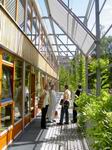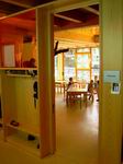 Blick in den Essbereich der "roten Gruppe".  Die Terrassen zum Garten hin ... ... sind von viel Licht und Grün geprägt.