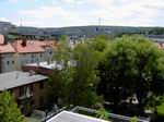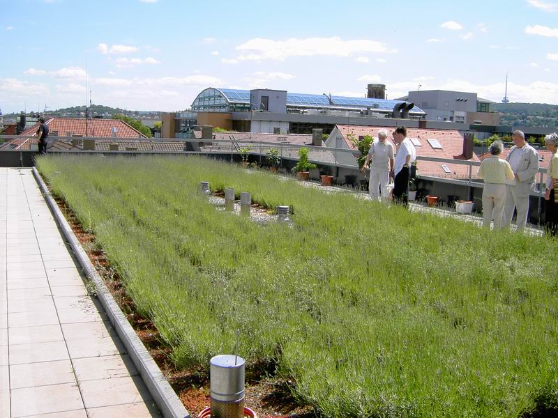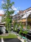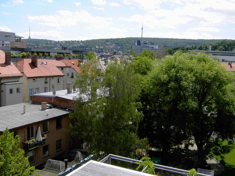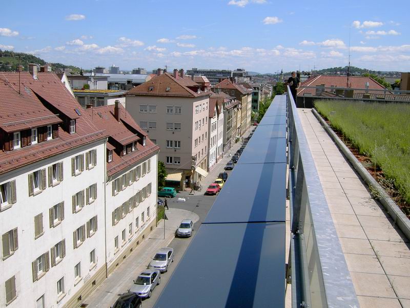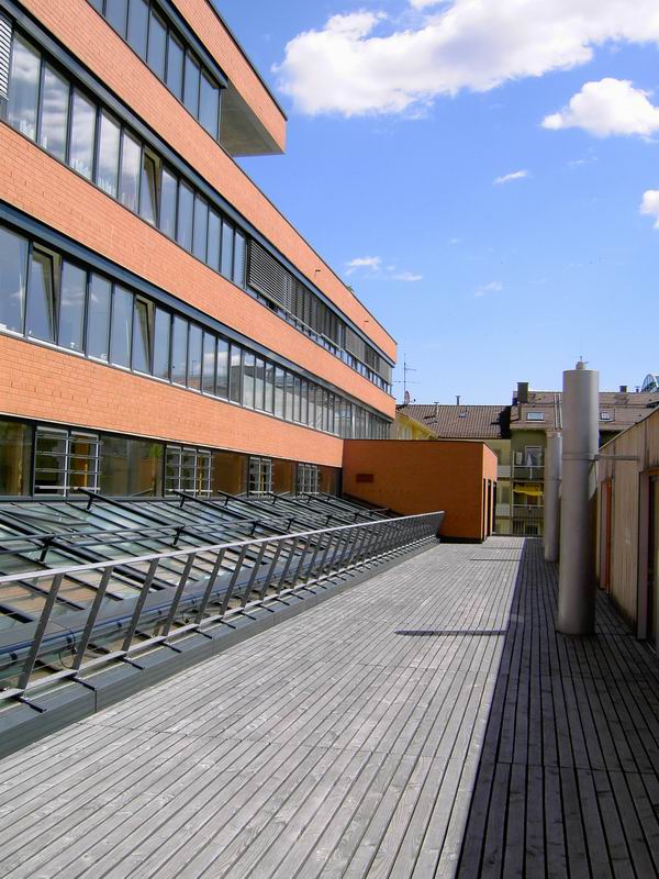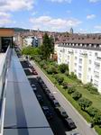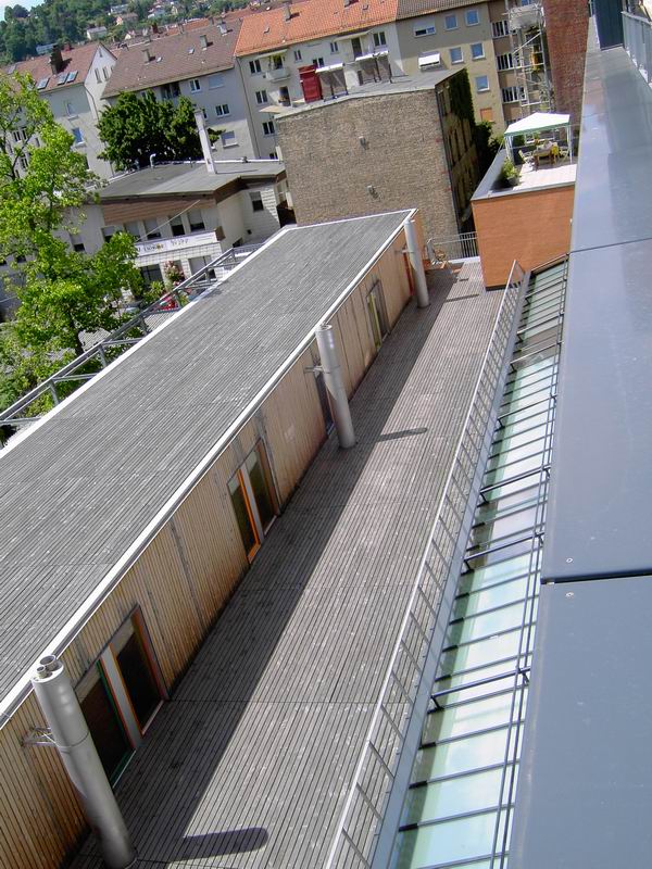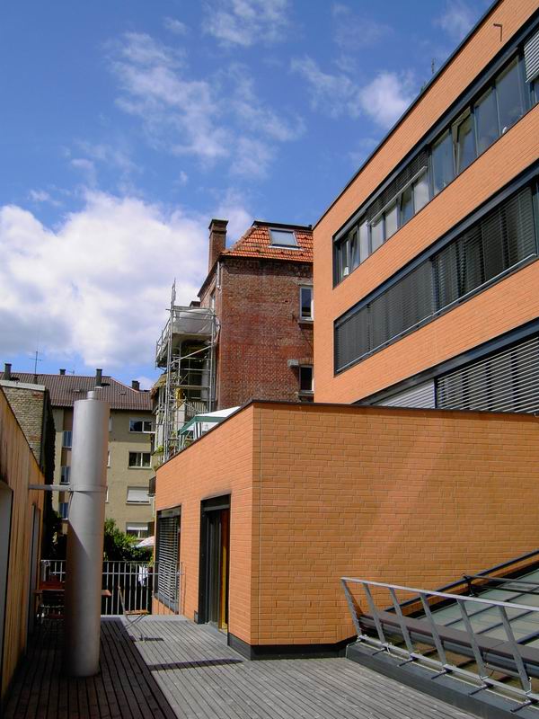 Dachterrasse für den Seniorenbereich. Blick auf die Ludwigstrasse. Die Dachterrasse in Richtung Stadtmitte gesehen.