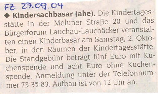 der Meluner Straße 20 den dritten KINDERSACHENBAZAR in den