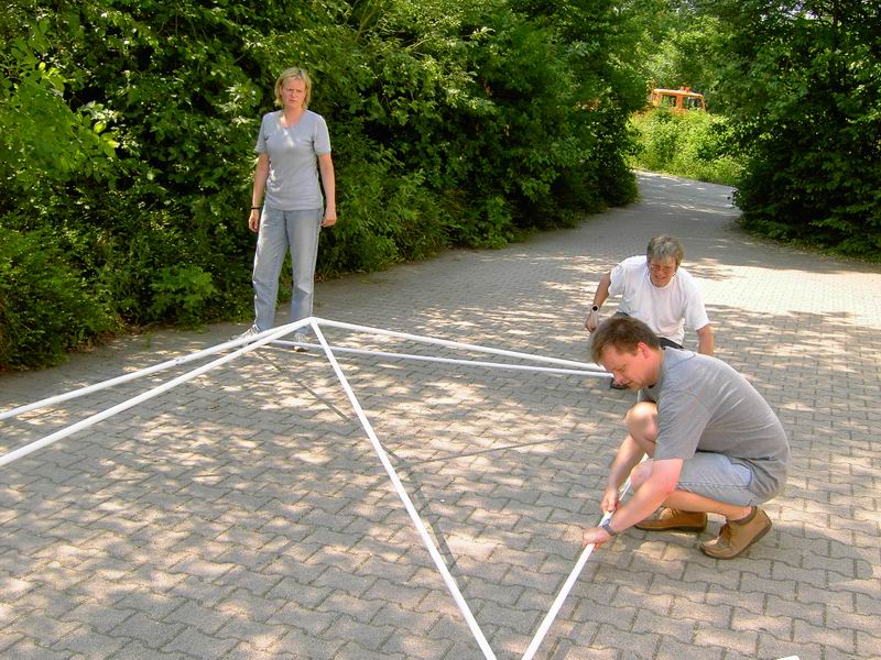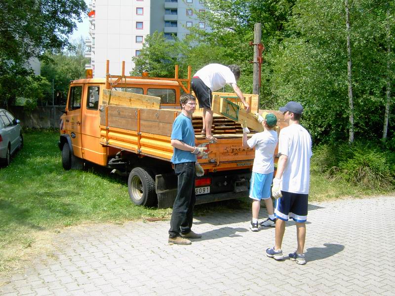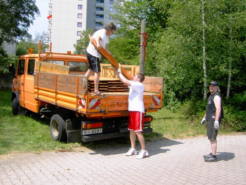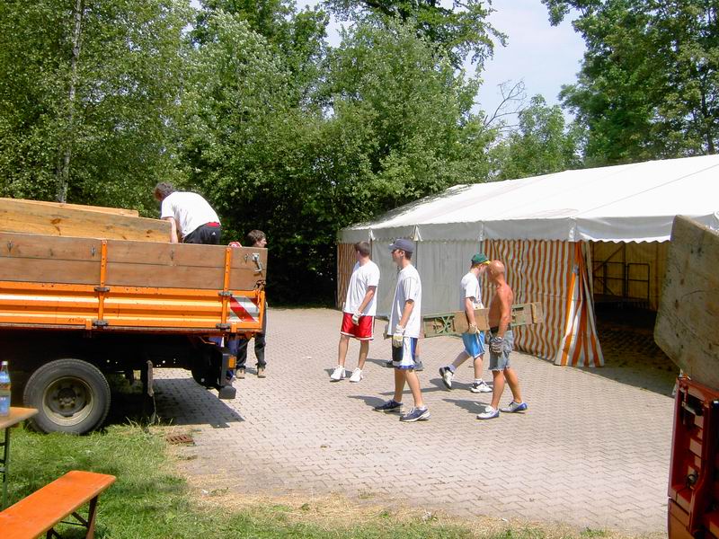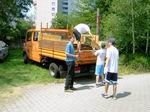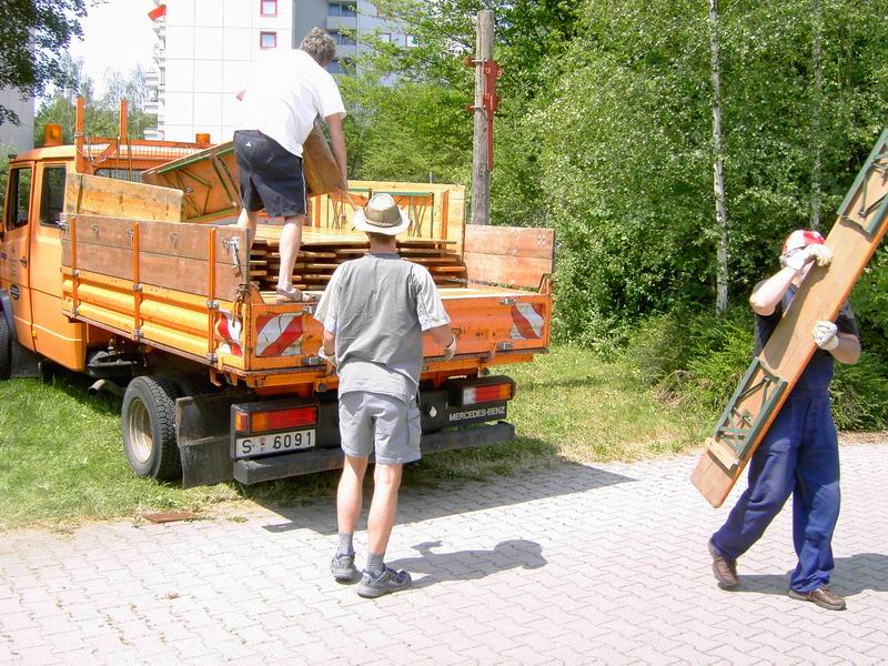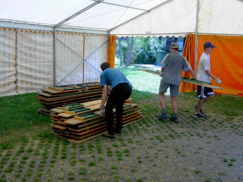 Am Freitag 24. Juni geht der Aufbau weiter. Zunächst holen wir die Sitzgarnituren ab. Dank des Einsatzes von Frieder Hirt bekommen wir vom Stuttgarter Fußballverein 1896 e.V. auf der Waldebene Ost und vom Zeppelingymnasium im Stöckach jeweils 25 Garnituren kostenfrei zur Verfügung gestellt. Beim Aufladen hatte ich keine Zeit, Bilder zu machen. Dank der Helfer von der IBC ging das Aufladen zügig. Dennoch waren wir erst um 12 Uhr wieder am Pavillon. Dann ging's gleich ans Abladen: