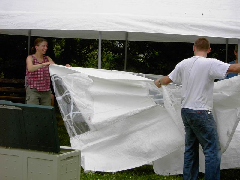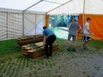 Die übrigen Planen der ersten beiden Zelte können wieder ...  ... zurück in die Transportkisten. Auch das dritte Zelt steht schon. Es beherbergt die IBC und die Tombola des Jungen Gemüses.