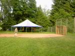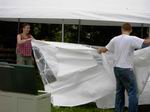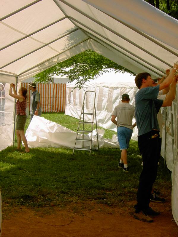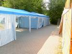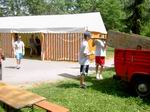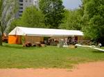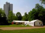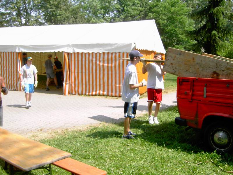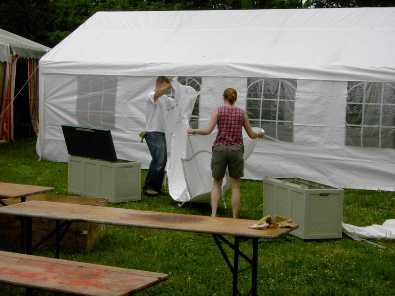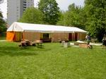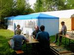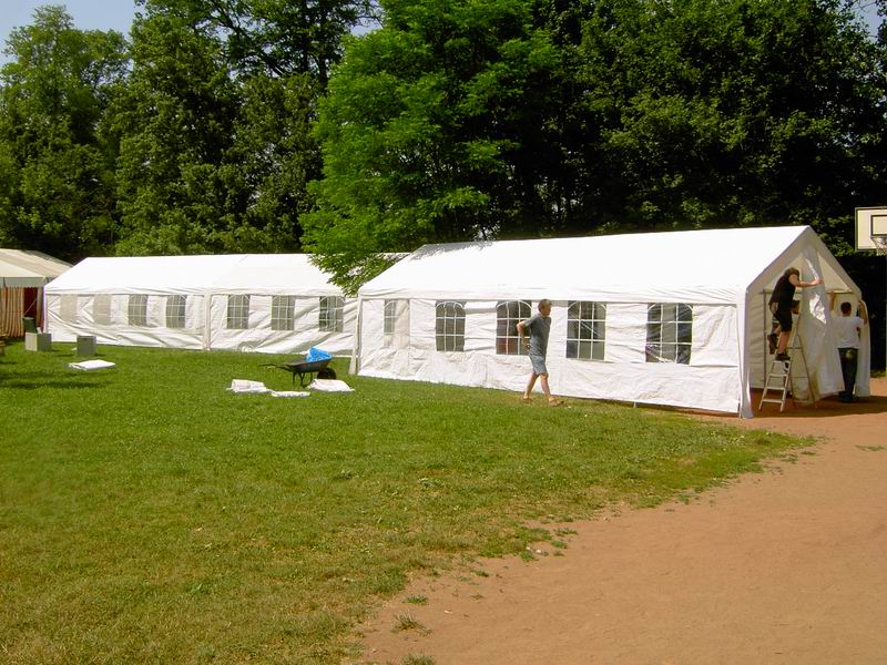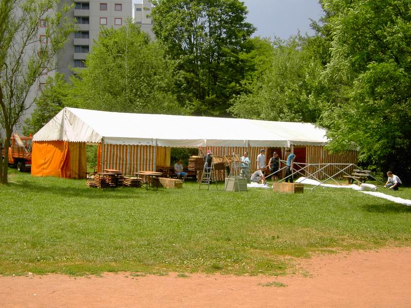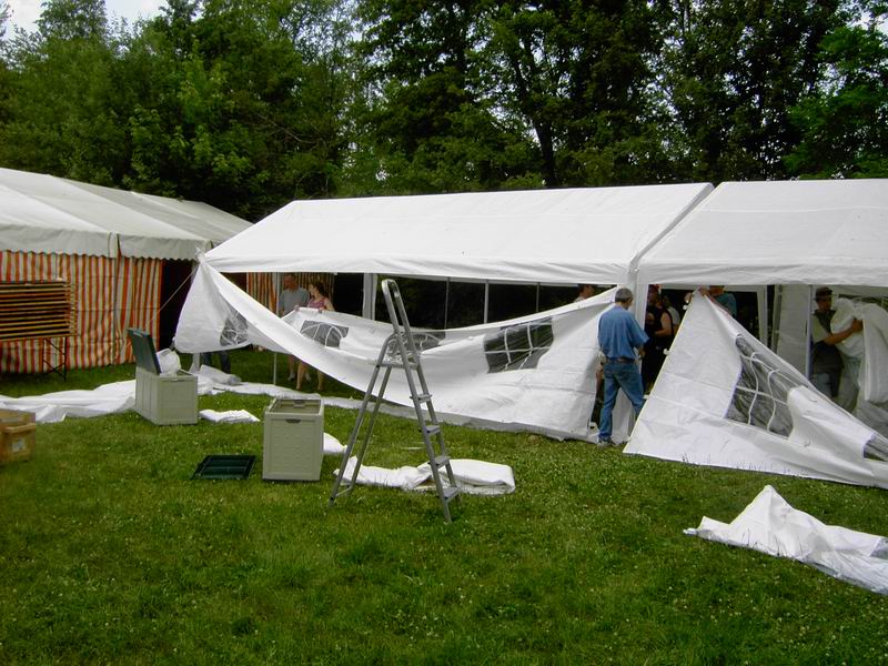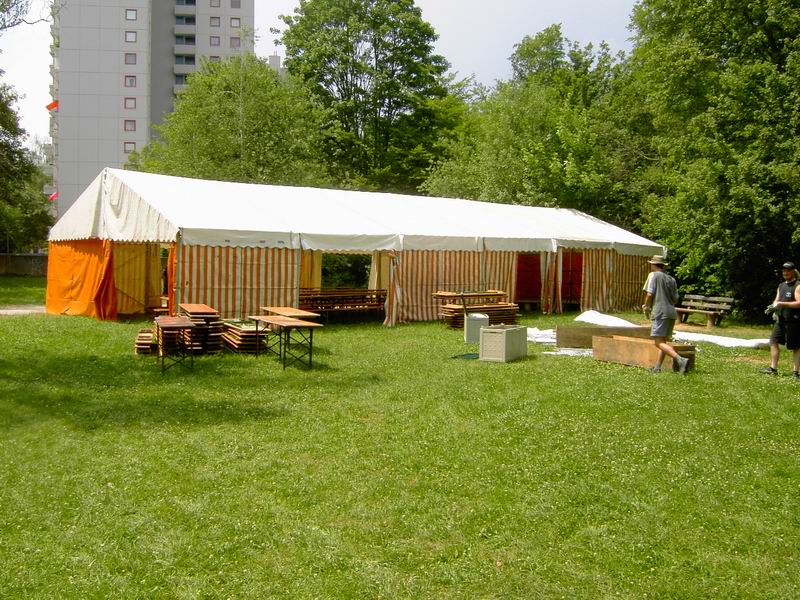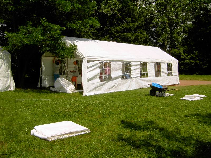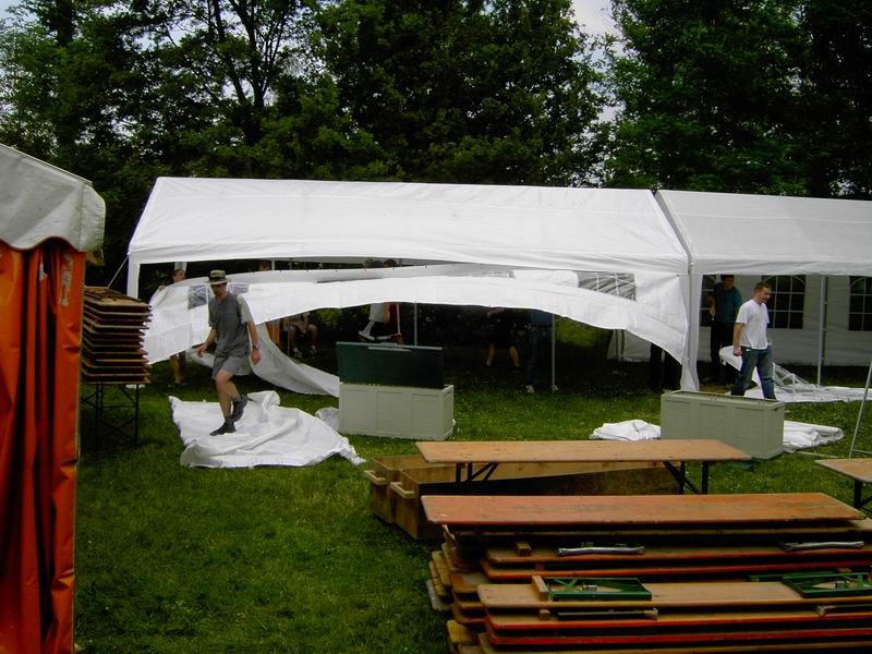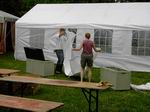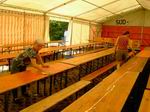 Der Festplatz bei wunderbarem Wetter. Letzte Handgriffe am dritten 4 auf 10 Meter großen Zelt. Das Dach muss noch verspannt werden.