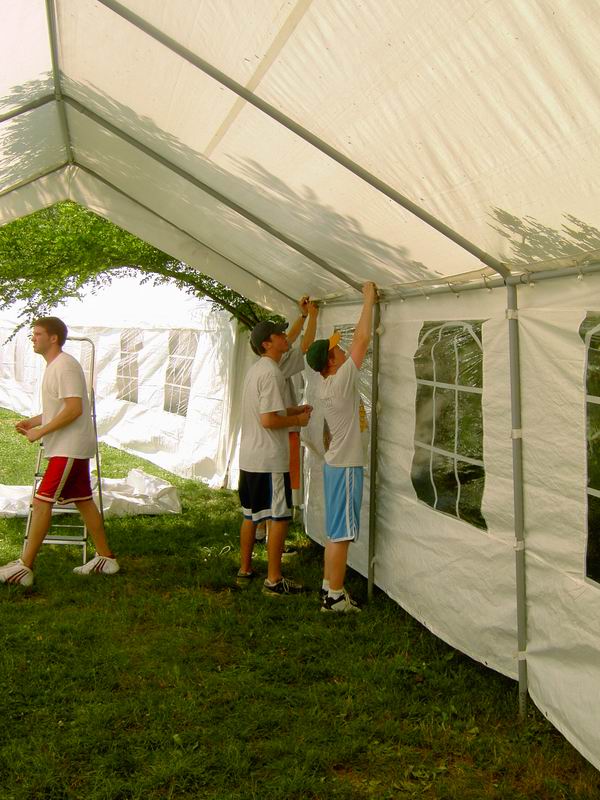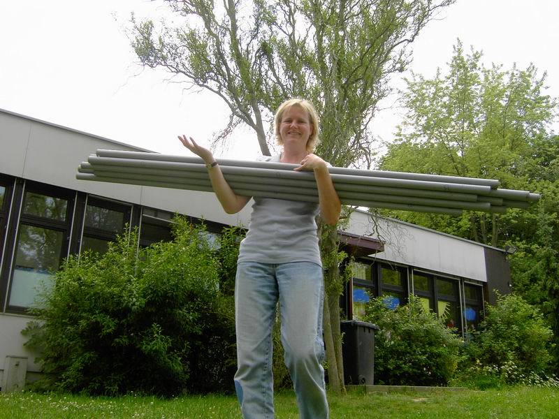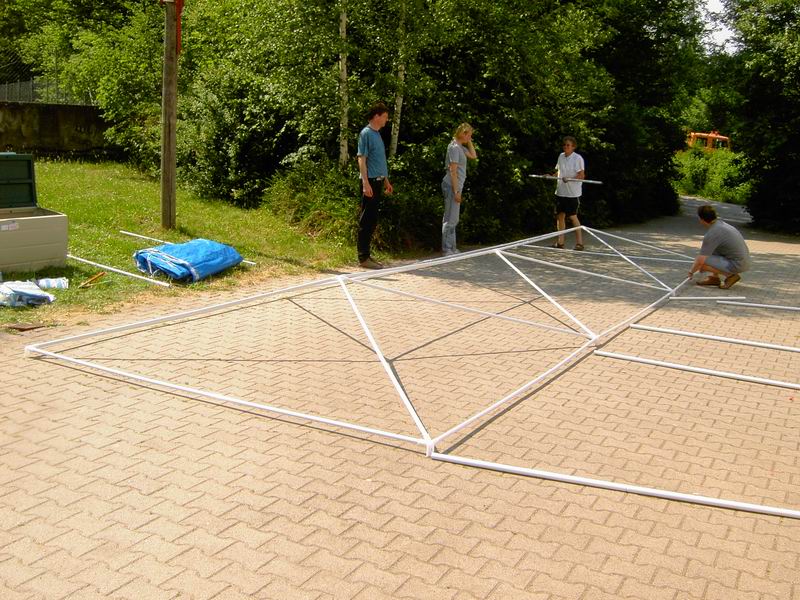 Der Aufbau der Zelte geht sehr zügig vonstatten.  Klaus ist auch zurück mit den Gartenwerkzeugen. Die paar Stangen?