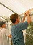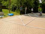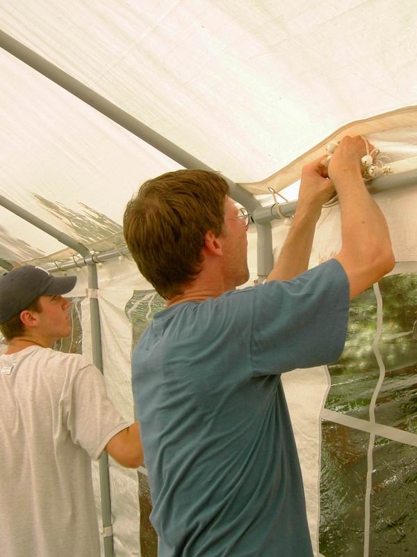 Vorne zusammen- gesteckt, rutscht's hinten wieder raus. Aber wir haben's dennoch geschafft. Und warm war's immer noch! Jetzt noch die Seitenwände zuknoten und sturmsicher machen.