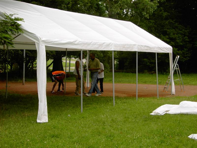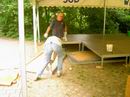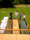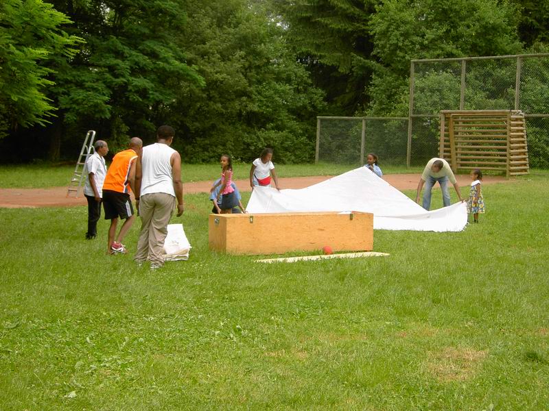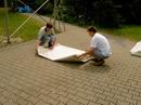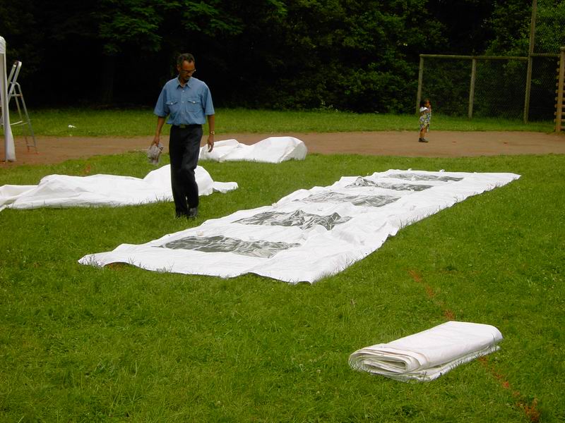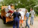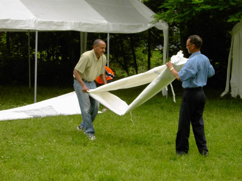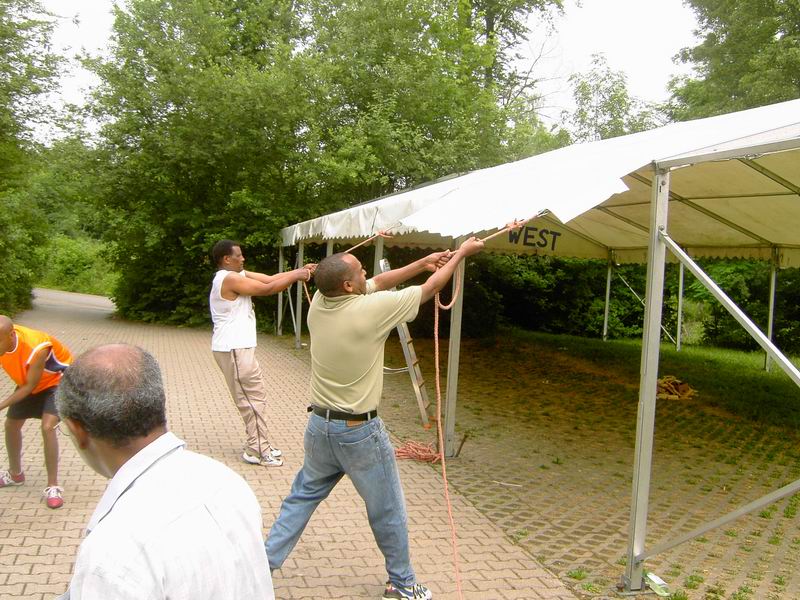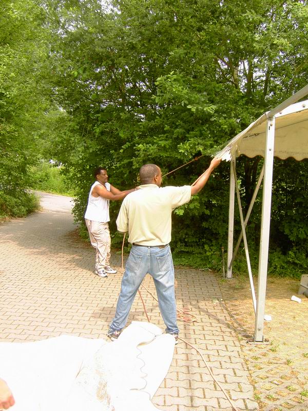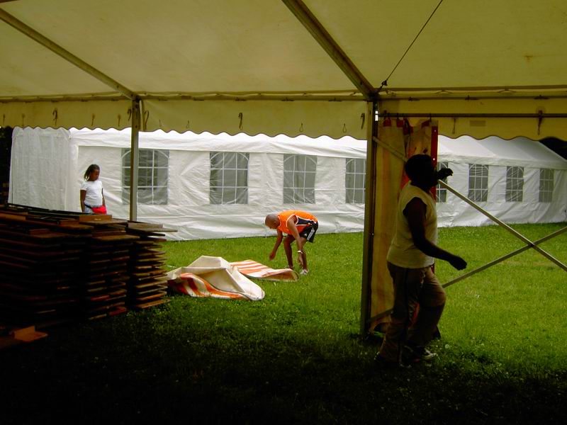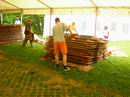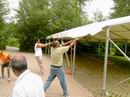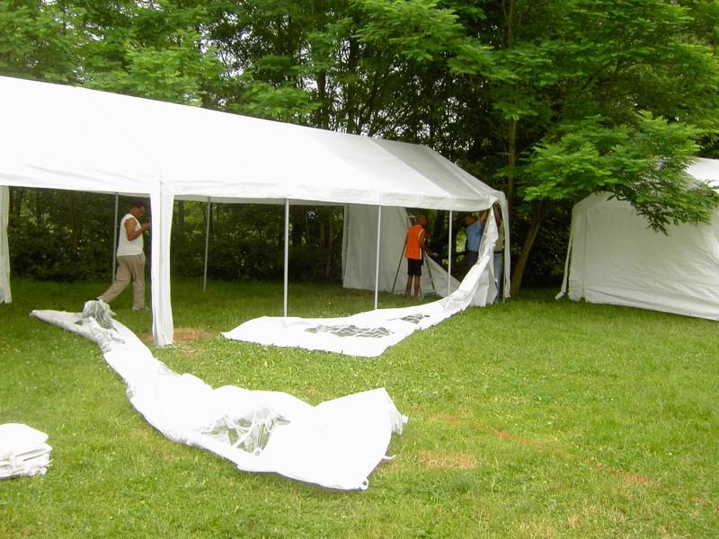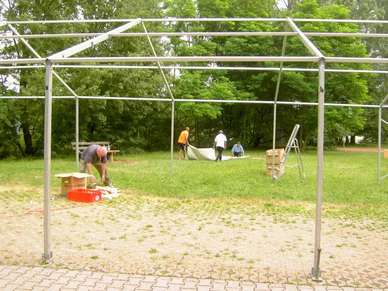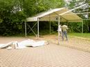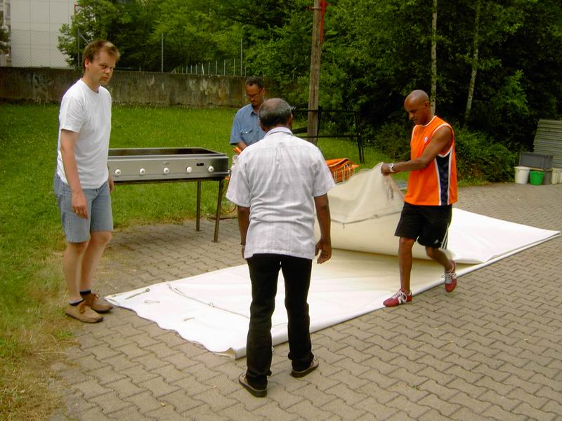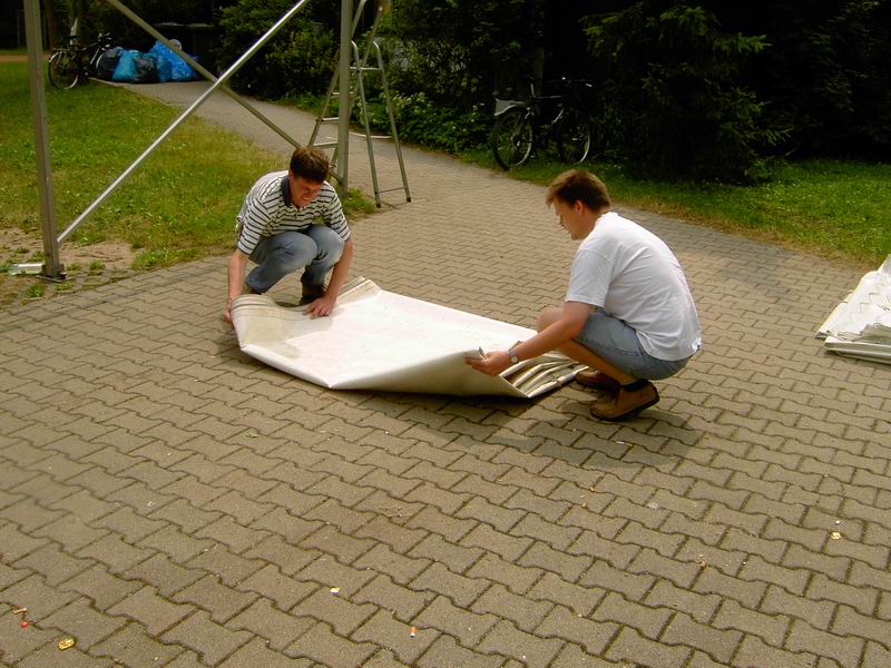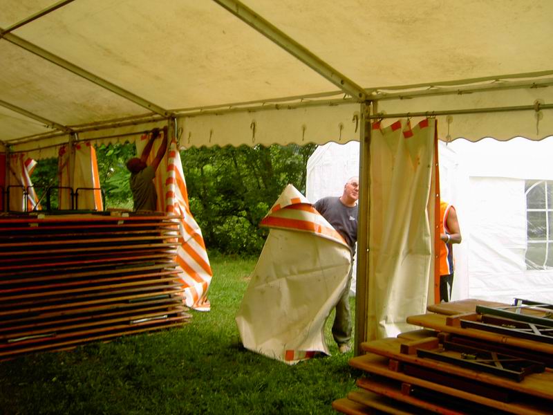 ... abziehen der Dachplanen des großen Zeltes. |