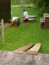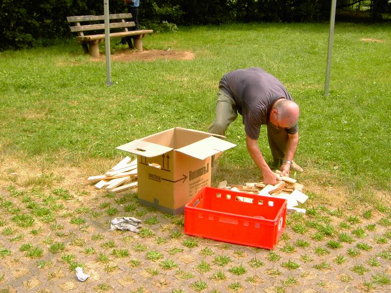 Hans sammelt seine Unterleghölzer ein. |