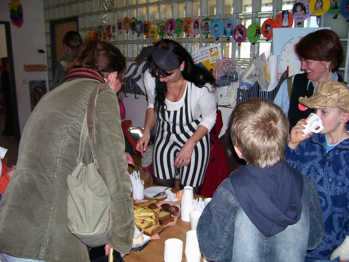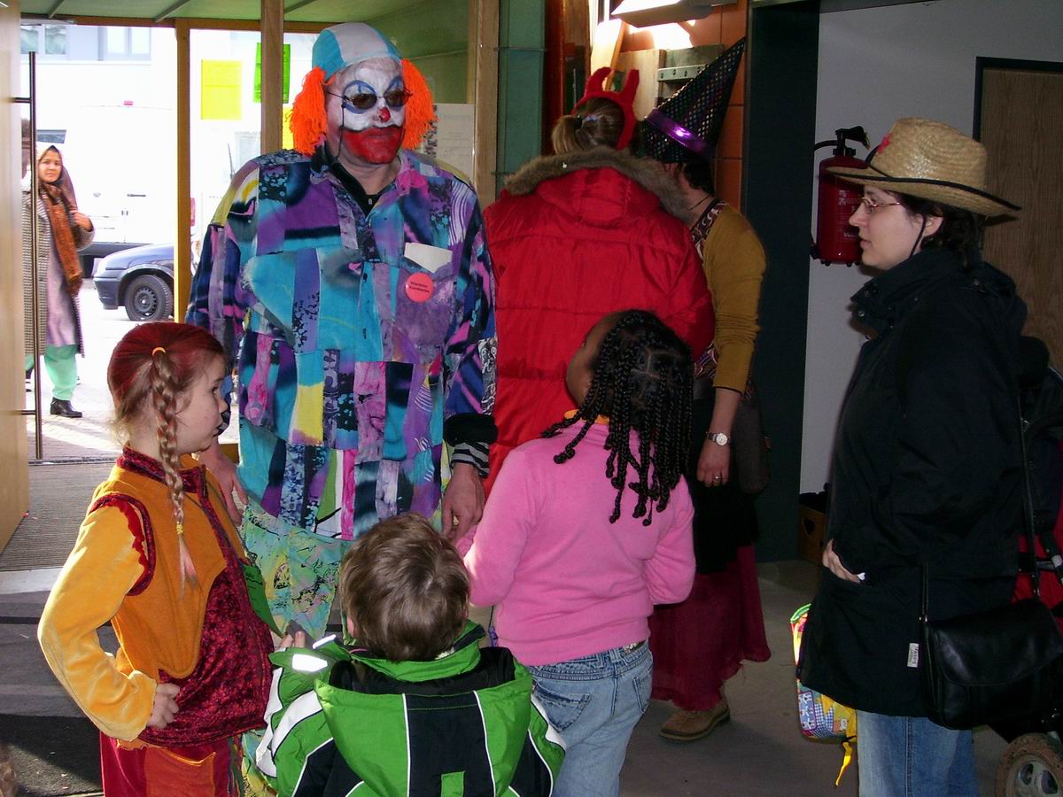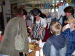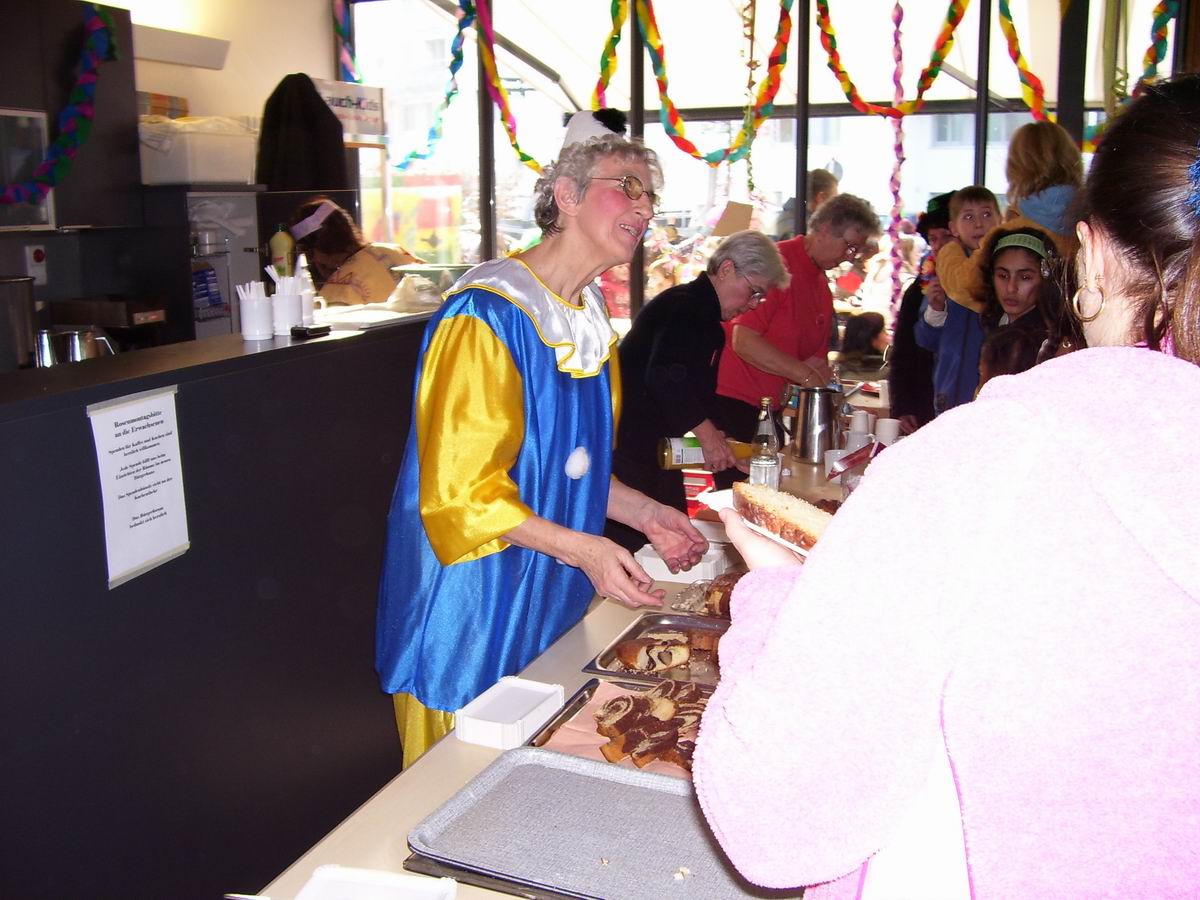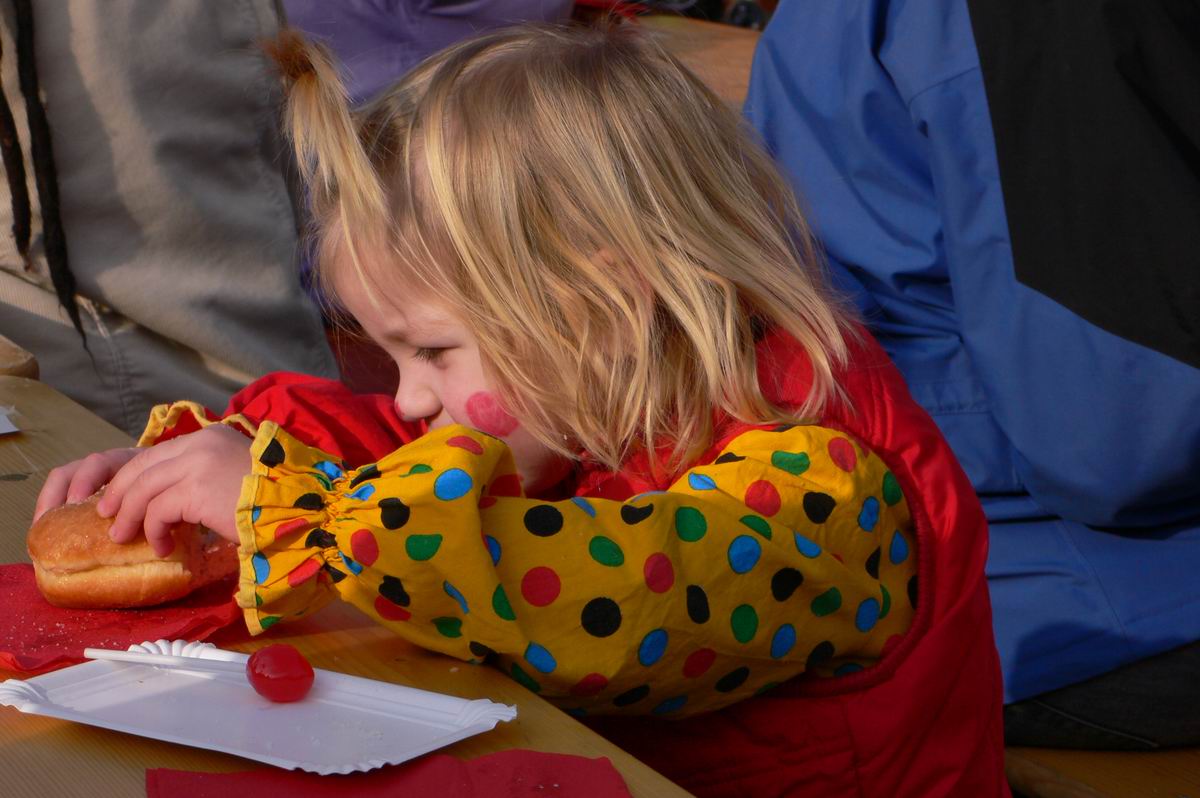 Der Harlekin Rita bedient an der Kuchentheke. Und alle lassen es sich gut schmecken.  Und auf geht es in die Turnhalle und zu den anderen Spielstationen.!