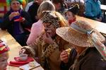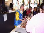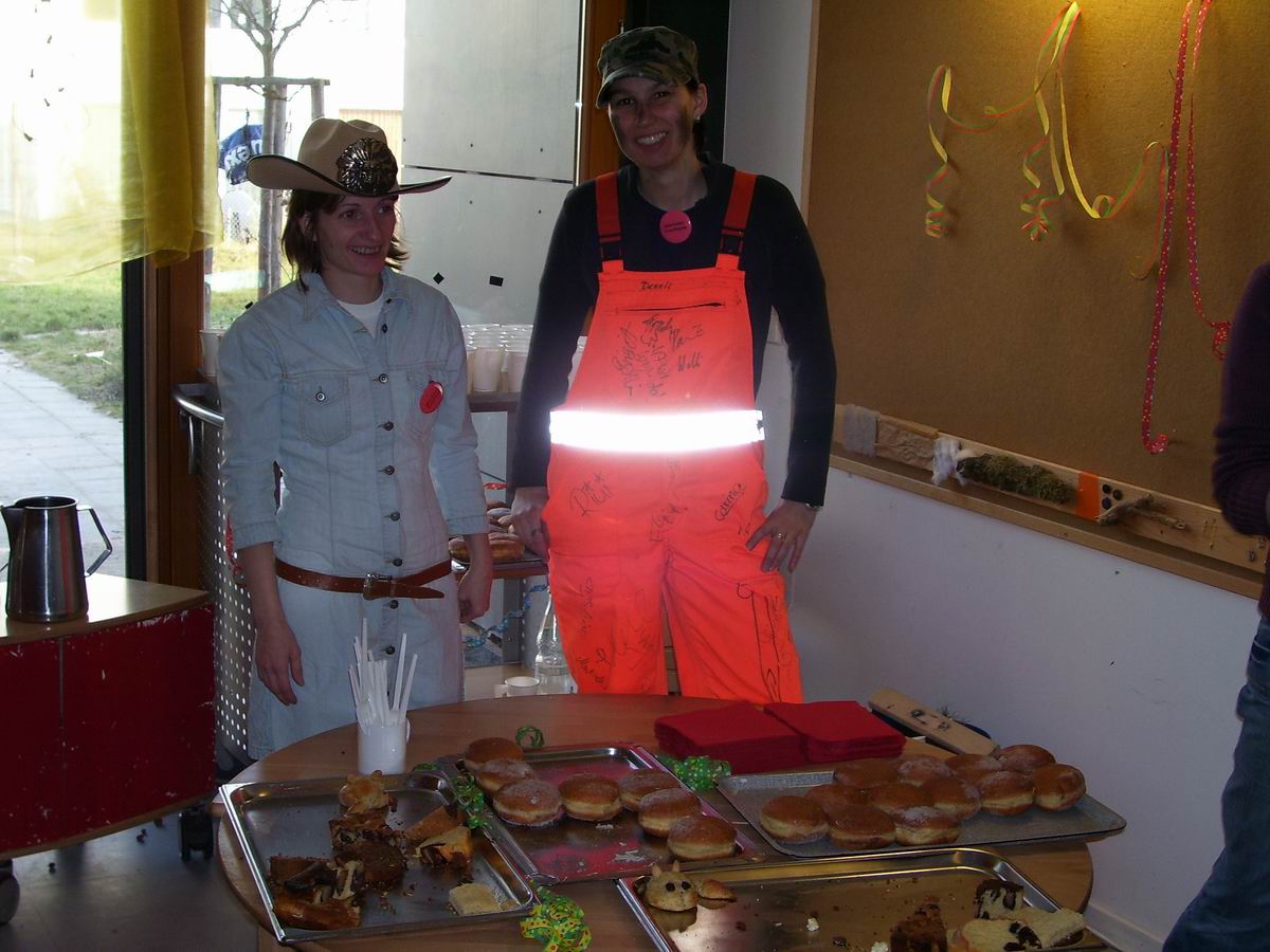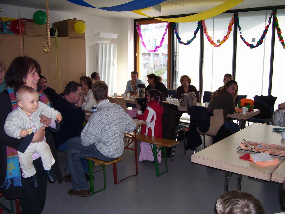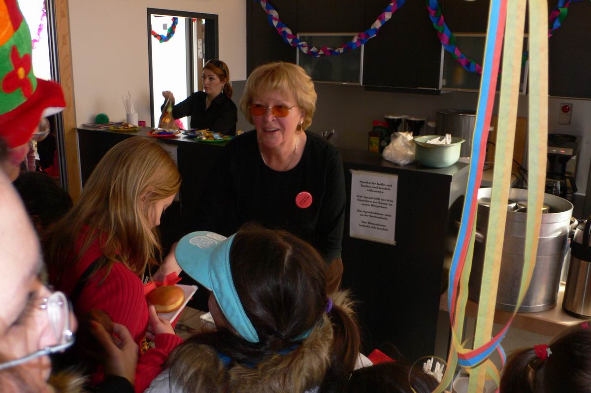 Der Harlekin Rita bedient an der Kuchentheke. Und alle lassen es sich gut schmecken.  Und auf geht es in die Turnhalle und zu den anderen Spielstationen.!