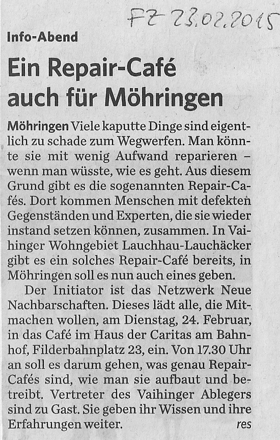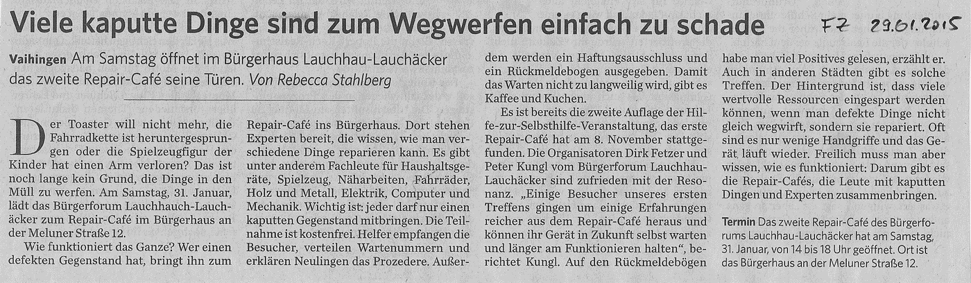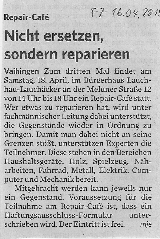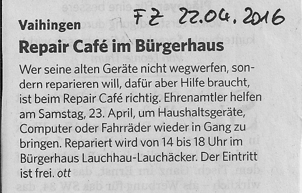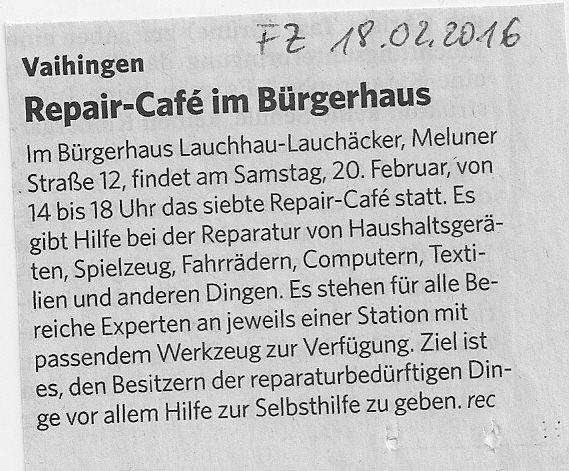 Ankündigung 7. Repair Cafe im Bürgerhaus