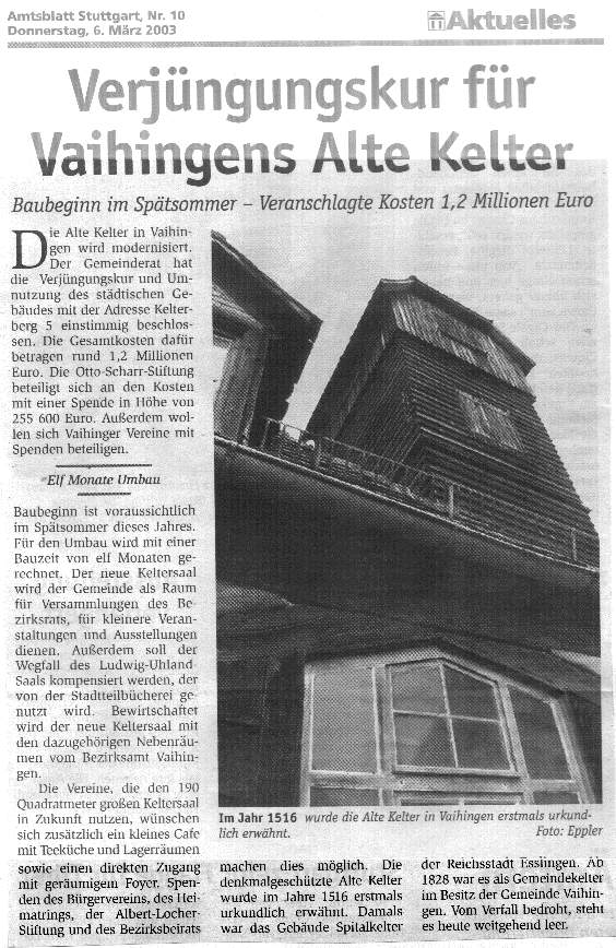Amtsblatt 06.03.2003 Verjüngungskur für Vaihingens Alte Kelter