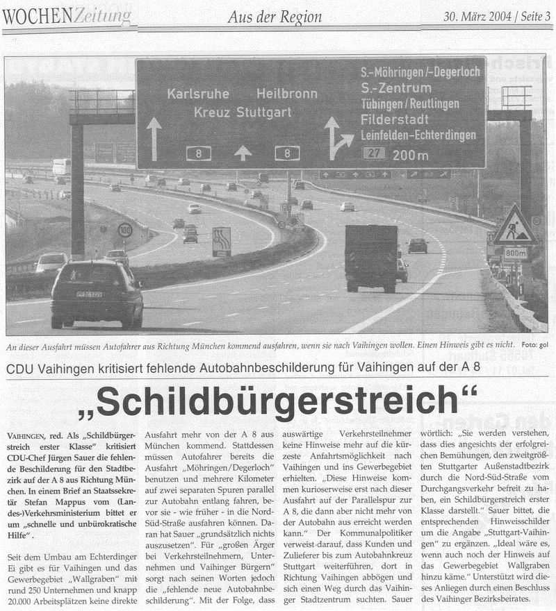 WOCHENZeitung 30.03.2003 "Schildbürgerstreich" (Zum Thema Beschilderung für Vaihingen auf der A8)