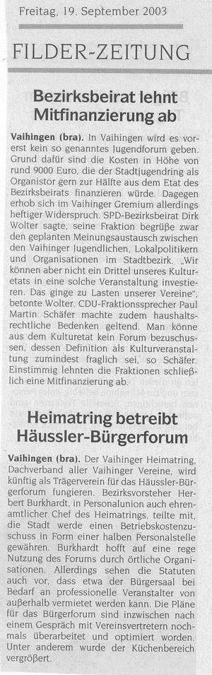 FILDERZEITUNG 23.09.2003 Bezirksbeirat lehnt Mitfinanzierung ab Heimatring betreibt Häussler-Bürgerforum