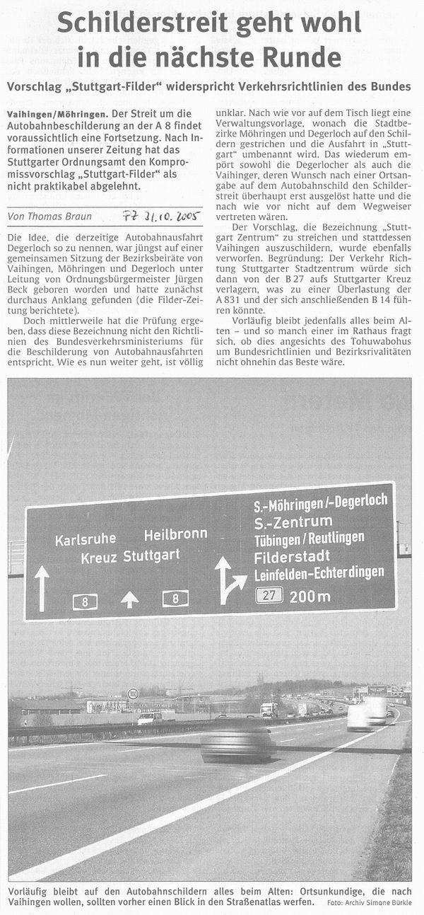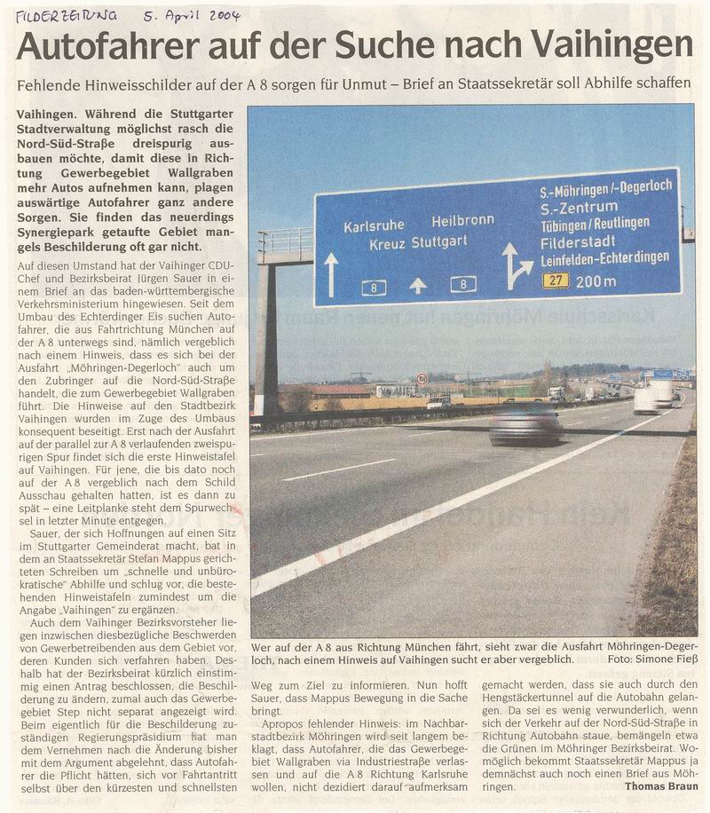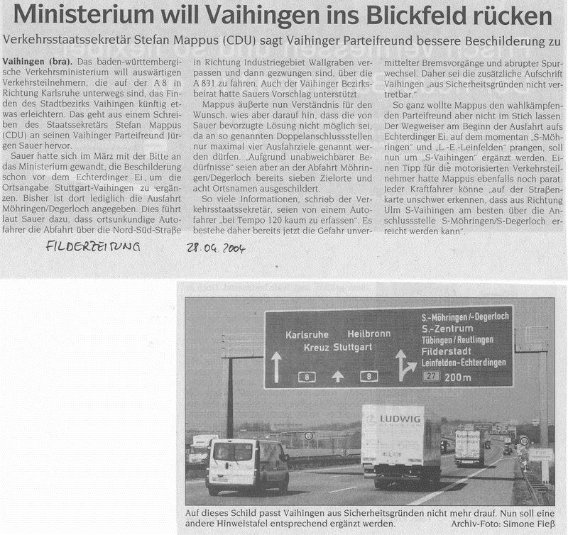 FILDERZEITUNG 28.04.2004 Ministerium will Vaihingen ins Blickfeld rücken (Beschilderung A8)