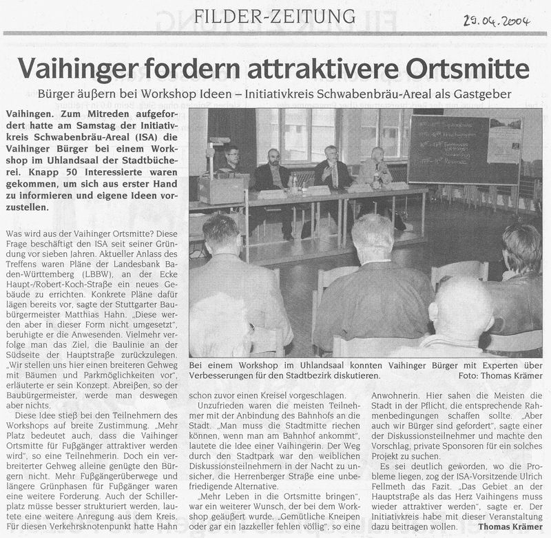 FILDERZEITUNG 26.04.2004 Vaihinger fordern attraktivere Ortsmitte > Link zur ISA