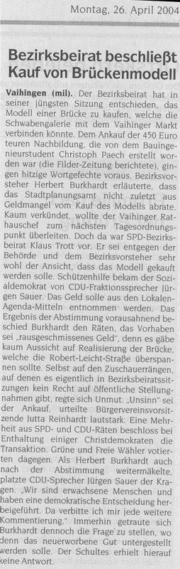 FILDERZEITUNG 26.04.2004 Bezirksbeirat beschließt Kauf von Brückenmodell