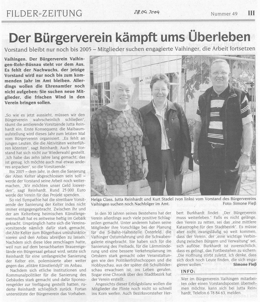 FILDERZEITUNG 28.04.2004 Der Bürgerverein (Vaihingen) kämpft ums Überleben