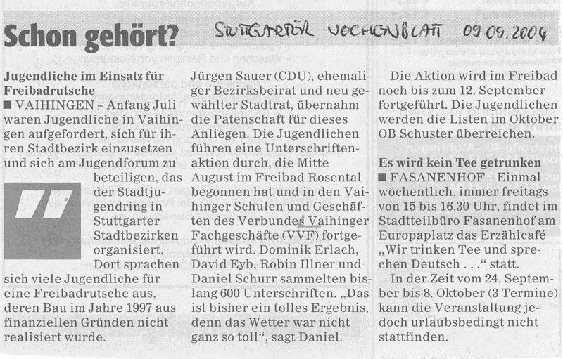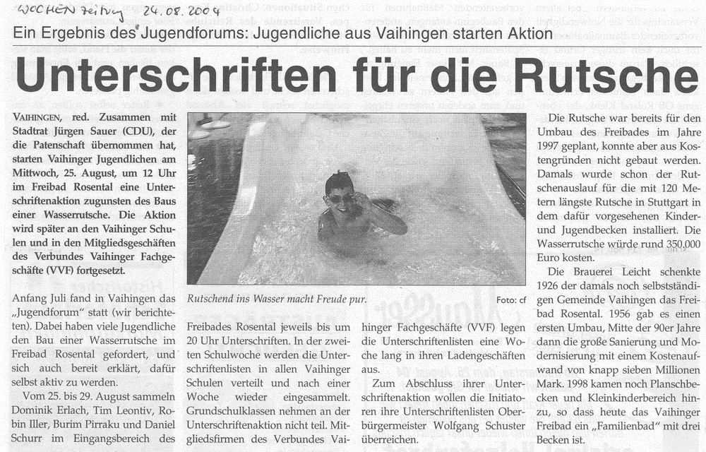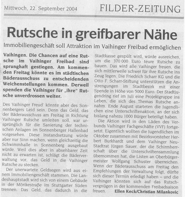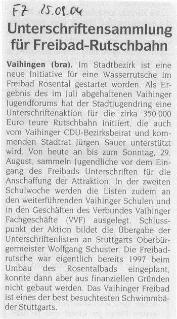FILDERZEITUNG 25.08.2004 "Unterschriftensammlung für Freibad-Rutschbahn"