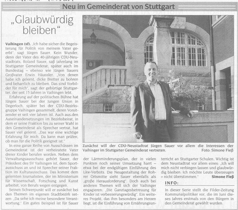 FILDERZEITUNG 24.09.2004 "Glaubwürdig bleiben" Jürgen Sauer Neu im Gemeinderat von Stuttgart