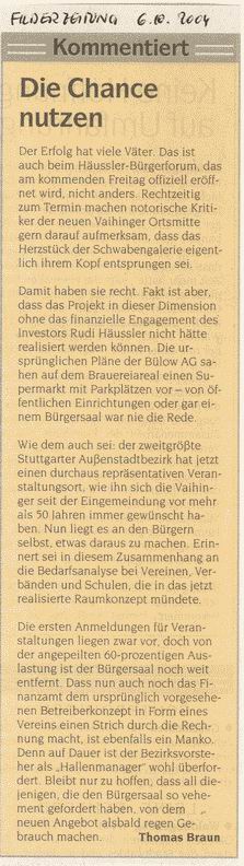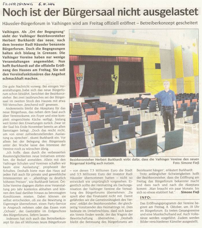 FILDERZEITUNG 06.10.2004 Noch ist der Bürgersaal nicht ausgelastet  ( Häussler-Bürgerforum)