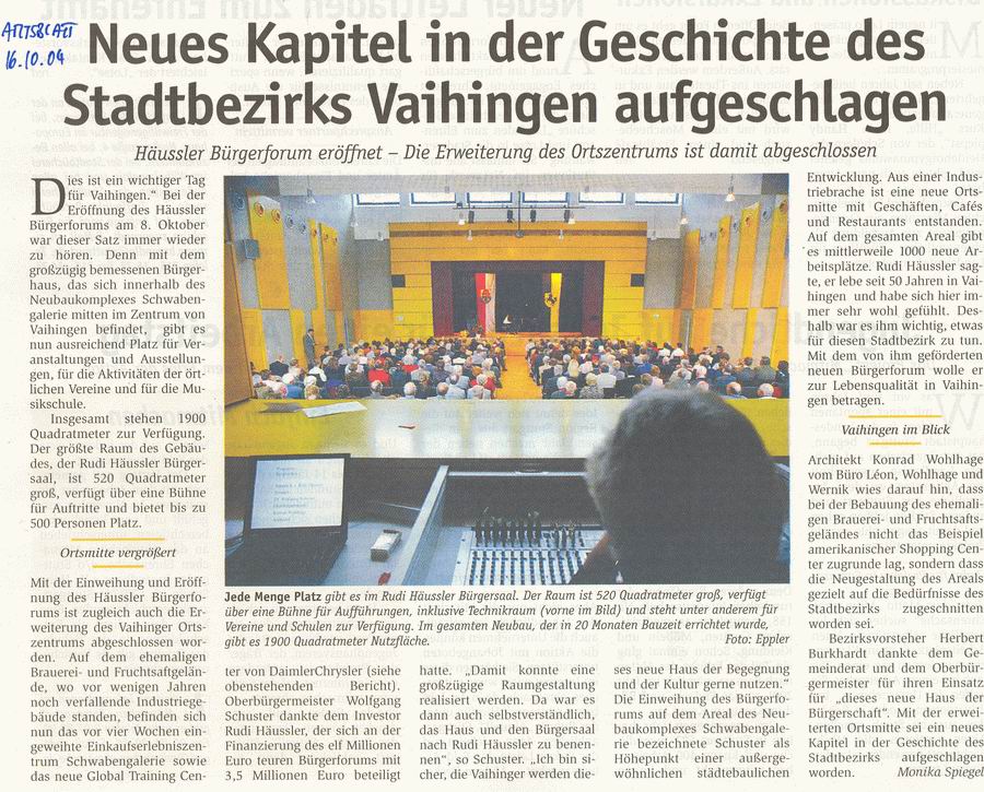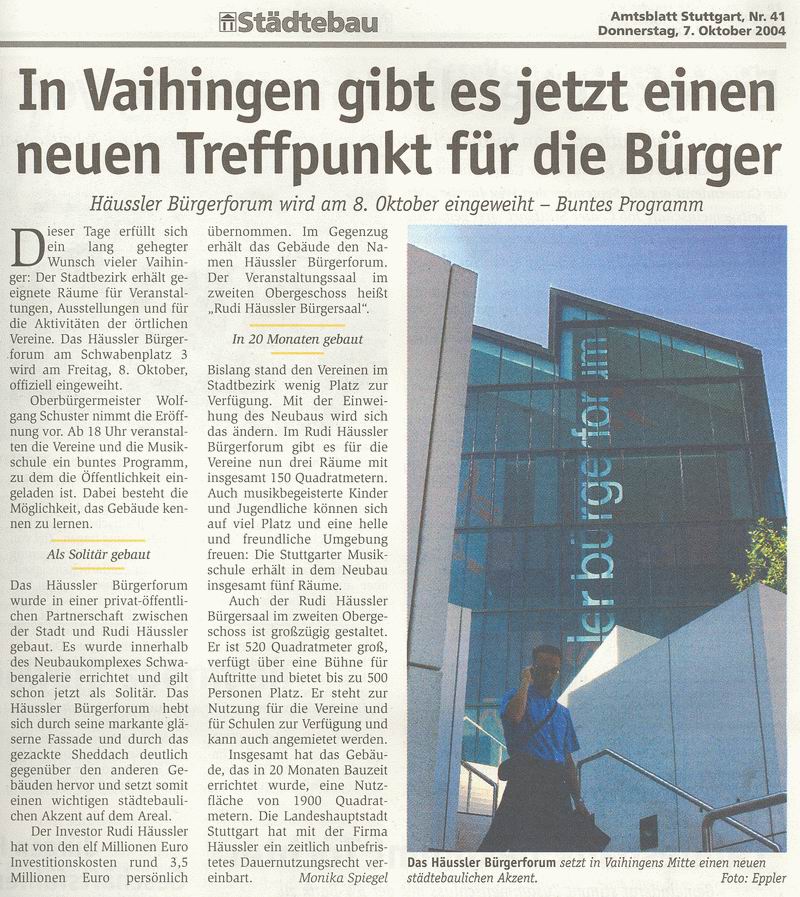 Amtsblatt 07.10.2004 In Vaihingen gibt es jetzt einen neuen Treffpunkt für die Bürger [webversion] Einweihung Häussler-Bürgerforum