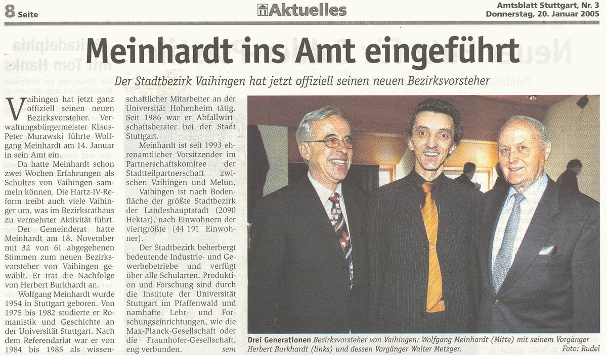 STUTTGARTER ZEITUNG 19.11.2004 Wolfgang Meinhardt ist Schultes in Vaihingen