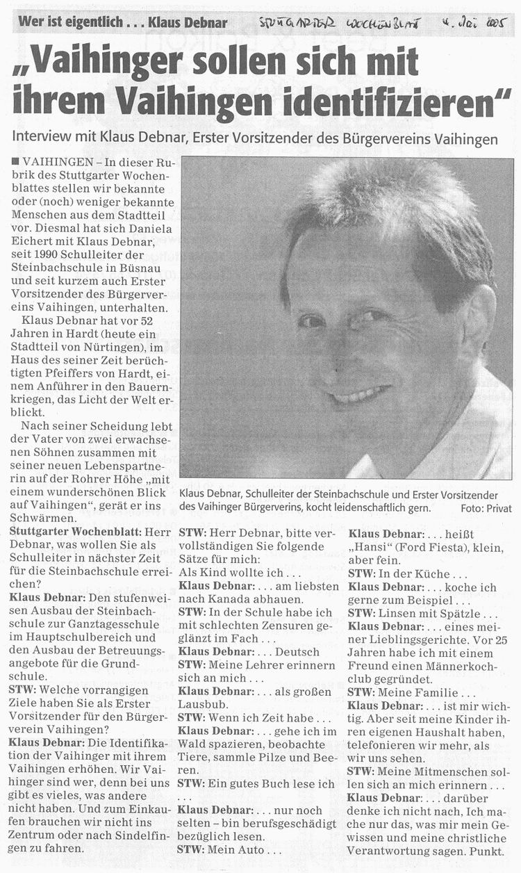 STUTTGARTER WOCHENBLATT 04.05.2005 "Vaihinger sollen sich mit ihrem Vaihingen identifizieren" Interview mit Klaus Debnar, Erster Vorsitzender des Bürgervereins Vaihingen