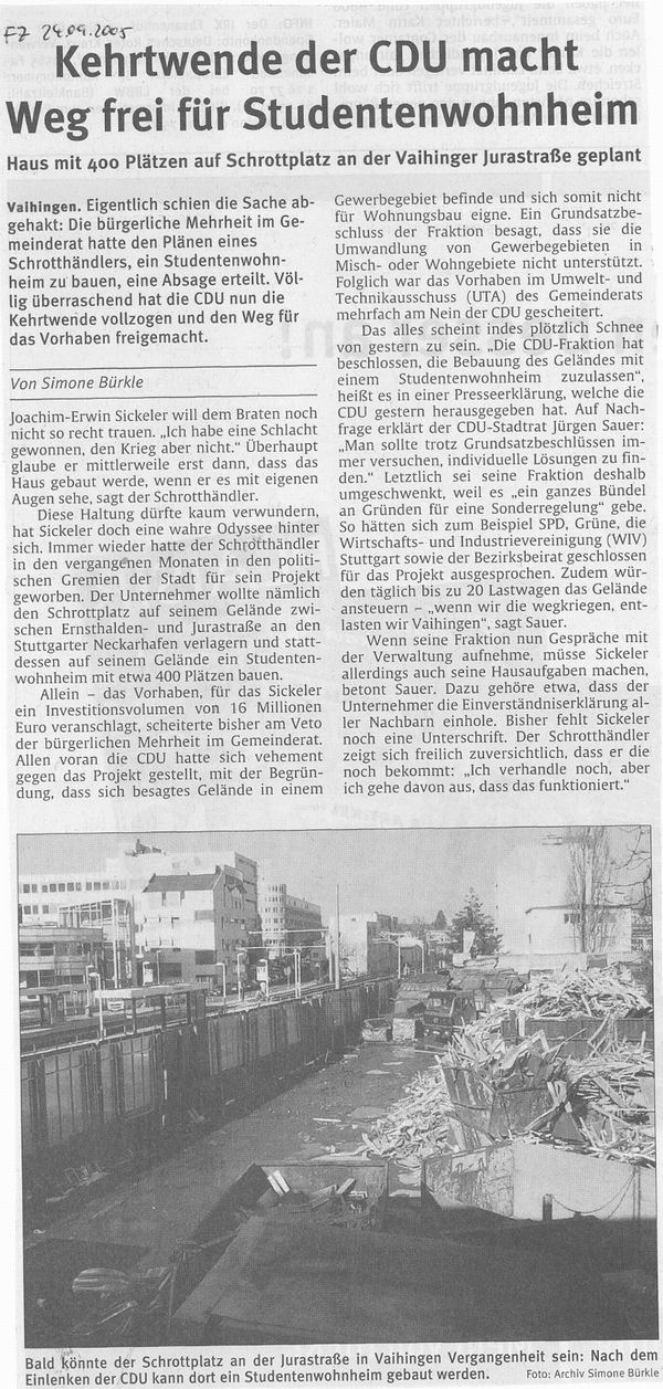 FILDERZEITUNG 24.09.2005 Kehrtwende der CDU macht Weg frei für Studentenwohnheim Haus mit 400 Plätzen auf Schrottplatz an der Vaihinger Jurastraße geplant