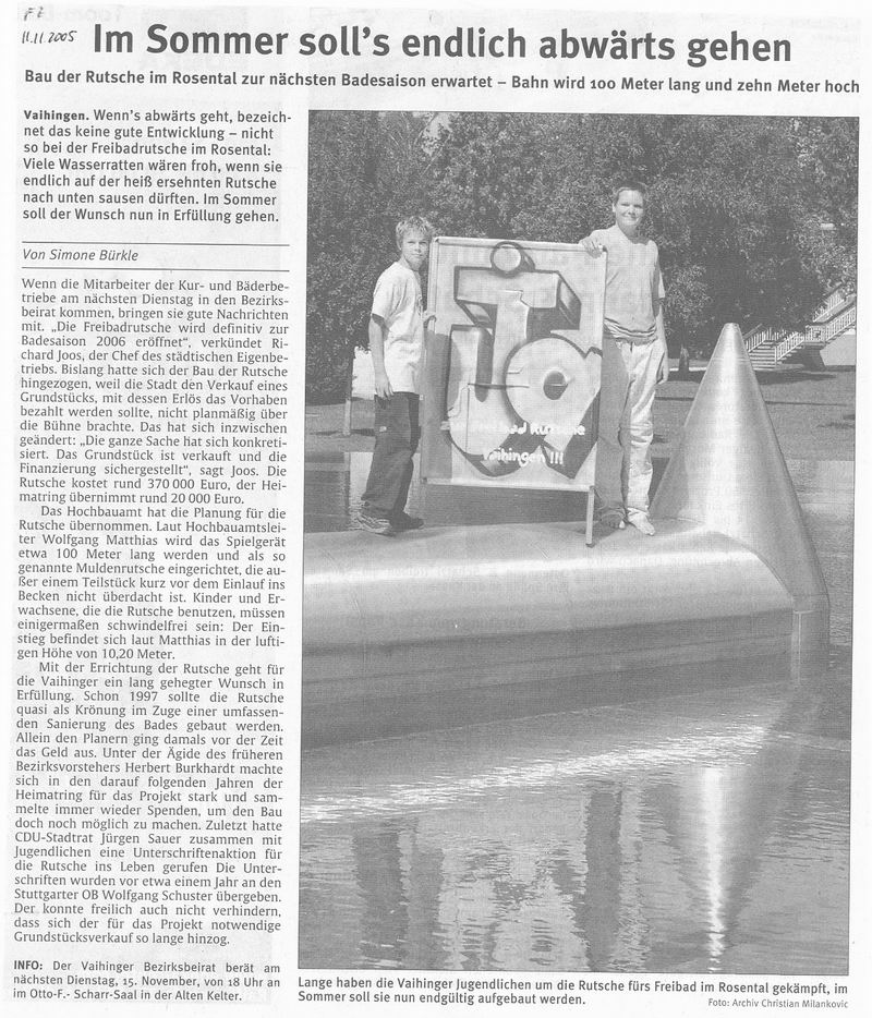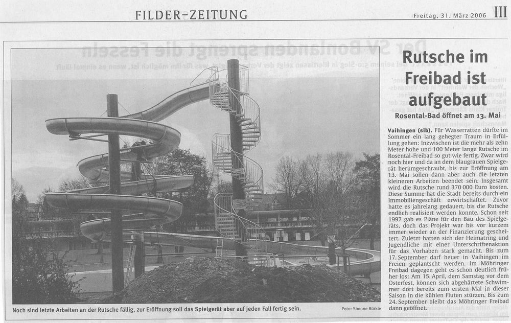 FILDERZEITUNG 02.03.2005 Vaihingens Rutscher landen vorerst auf dem Trockenen  Riesenrutsche im Freibad Rosental wird dieses Jahr nicht gebaut