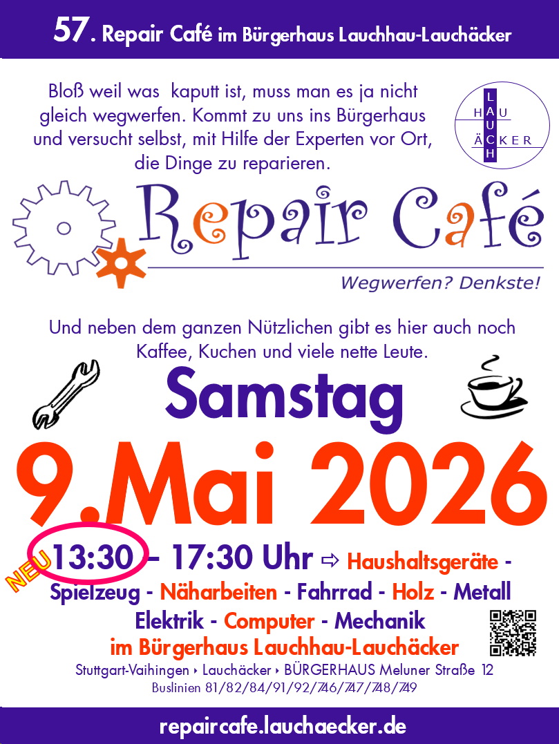 57. REPAIR CAFE Lauchhau-Lauchäcker im Bürgerhaus (STZ) Einlass: 13:30 Uhr Letzter Einlass: 17:30 Uhr